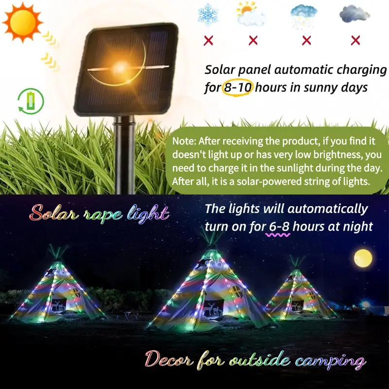 ✨ Transform your space with these solar rope lights! Perfect for parties, gardens, porches, yards, homes, weddings, vacations, and graduation decorations. The malleable PVC tube cover allows for easy wrapping around shapes like snowmen or superhero figures. Enjoy the magic of these lights!