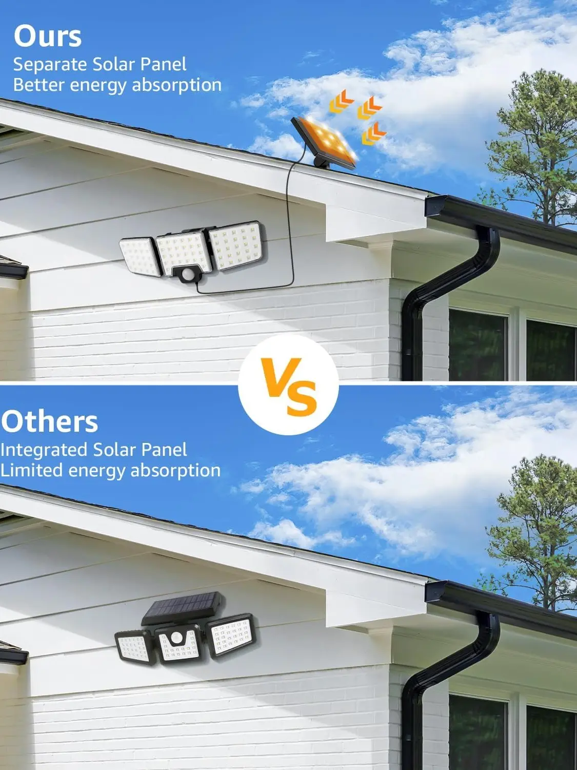 Compared with traditional solar lights, our solar panels and lights adopt a unique split design, which connects by a 3M long cable. You can choose a sunny location for the solar panel to avoid affecting the solar energy absorption efficiency due to shading by trees and eaves.