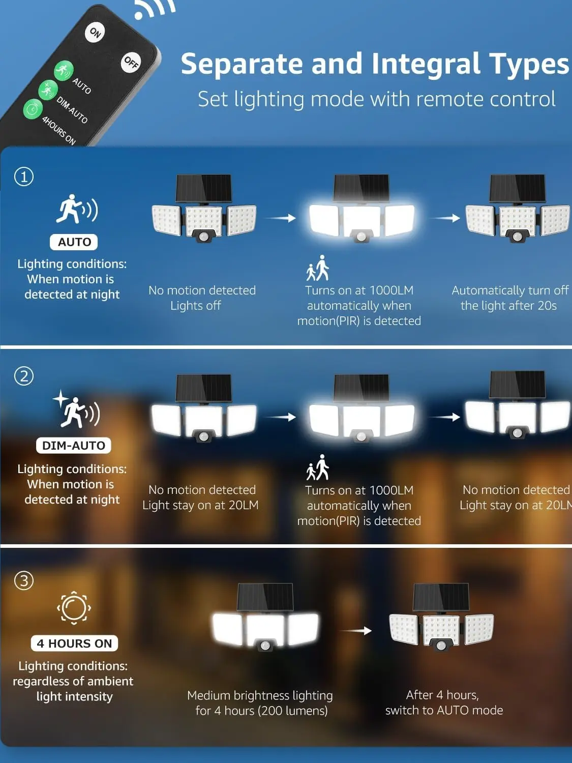 ·Motion Sensor & Remote Control - The security light is equipped with high-sensitivity motion and optical sensors. It automatically turns on when it detects people or cars at night, with a sensing distance of 8-10 meters and a sensing angle of 120 degrees. It offers two lighting modes: AUTO mode and DIM-AUTO mode, which can be selected using the included remote control. This allows you to choose the lighting mode suitable for different scenes.