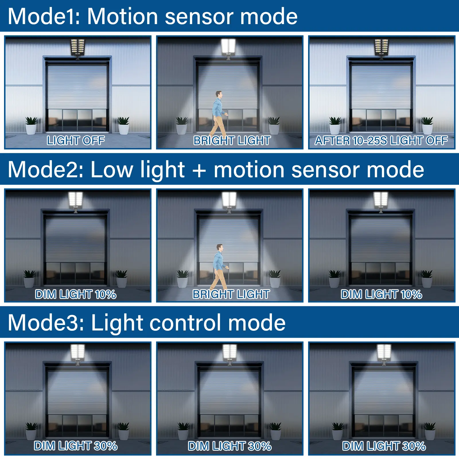 【Remote Control and Dusk to Dawn】Our solar street lights are equipped with sensitive motion sensors to cover a wide area, allowing you to experience convenience. These street lights are available in a variety of modes to suit your needs, including a motion sensor mode for detecting proximity and a timer mode for presetting the duration of the lighting. Brightness adjustment ranges from 25% to 100%, allowing for personalized lighting.