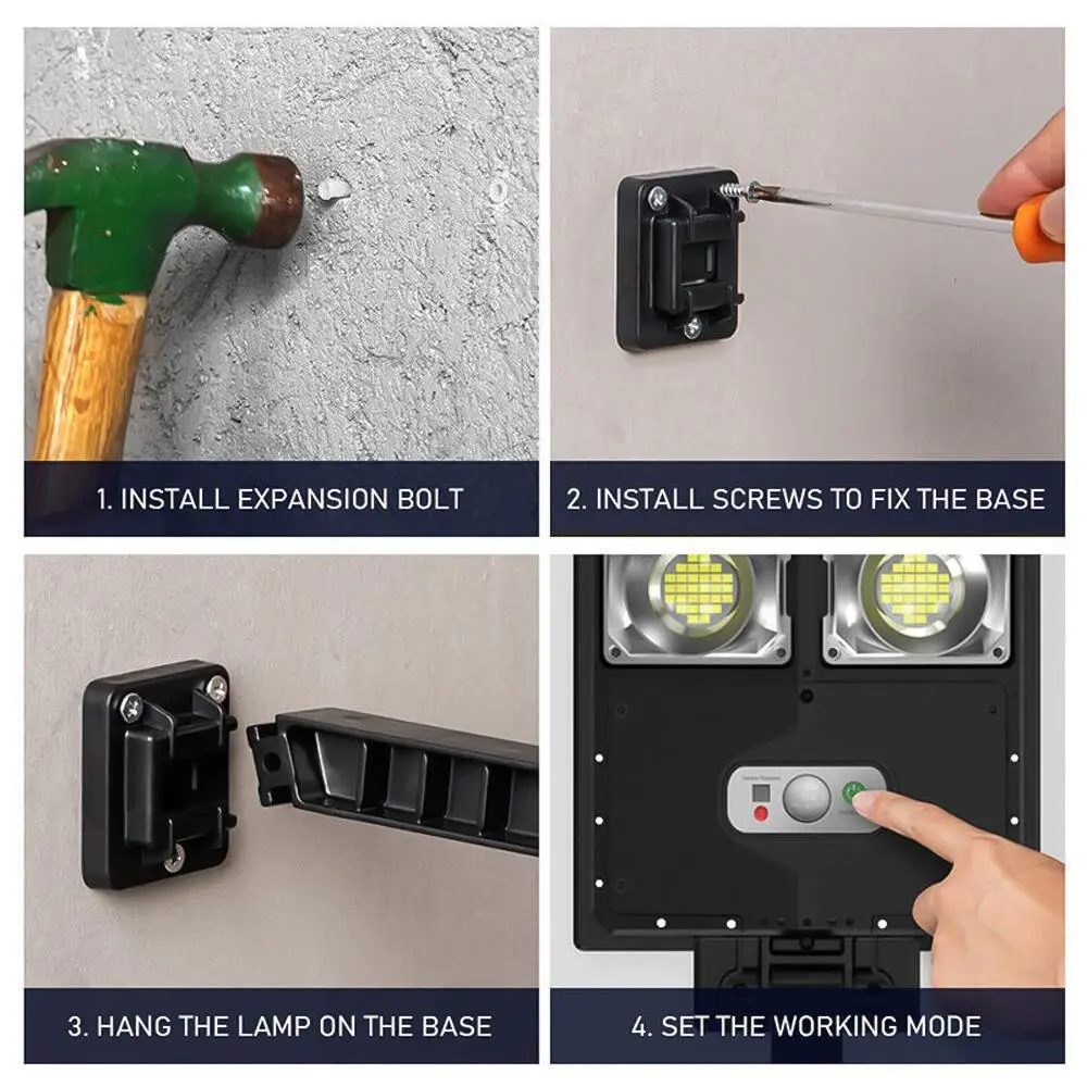 Easy to install, this kit comes with screw set and base for easy installation. Simply screw the base to the wall of any material, and then attach the solar light; suitable to used as yard light, garage light, garden light, parking lot light, exit light, entrance light, driveway light, patio light, entryway light, etc.