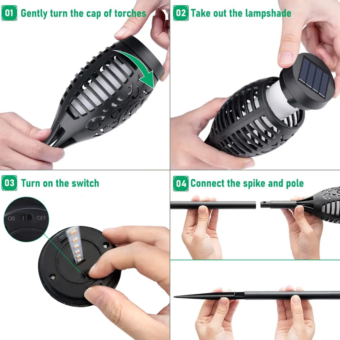 Arrived in a damaged box marked that the deliverer received it damaged. No instructions. Easy enough to put together and get in the ground but after two sunny days, there was no light. On the 3rd day, I found the on/off switch and they lit up. They do not emit very much light at all.