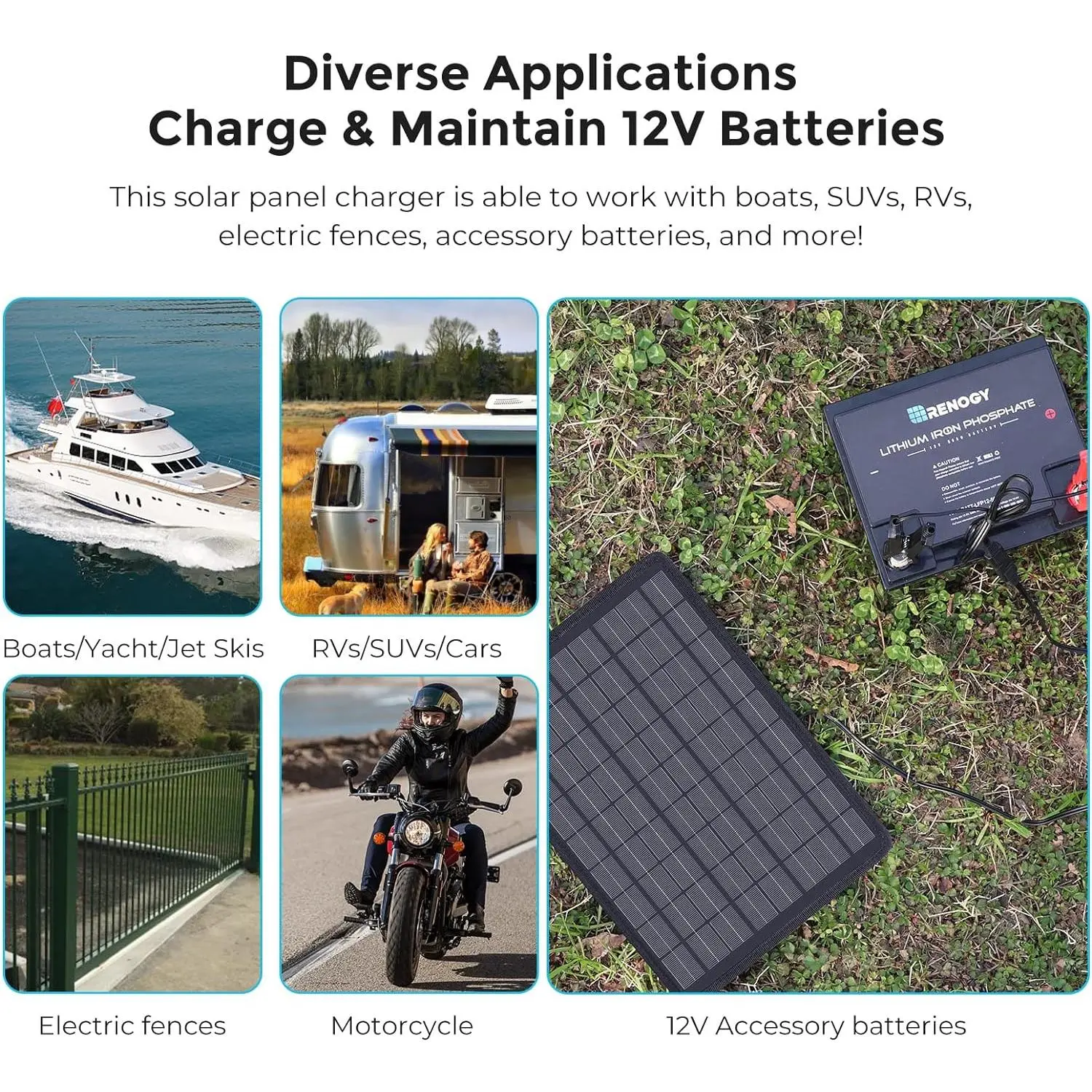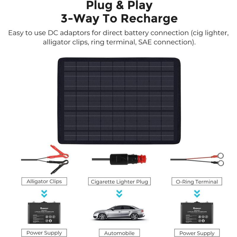 Over time batteries naturally lose power and, if allowed to, can go flat. Renogy’s 10W Solar Battery Trickle Charger Maintainer will help you maintain a healthy battery by converting solar energy into a usable 12V DC current to keep your battery topped off at a stable level. With a quick SAE connection and 3 options for ring terminals, alligator clips, and cigarette lighters, our Solar Battery Trickle Charger Maintainer is sure to be a great fit no matter what your application needs. It works great with boats, SUVs, RVs, electric fences, accessory batteries, and much more! Maintain a healthy battery and never be caught flat ever again!