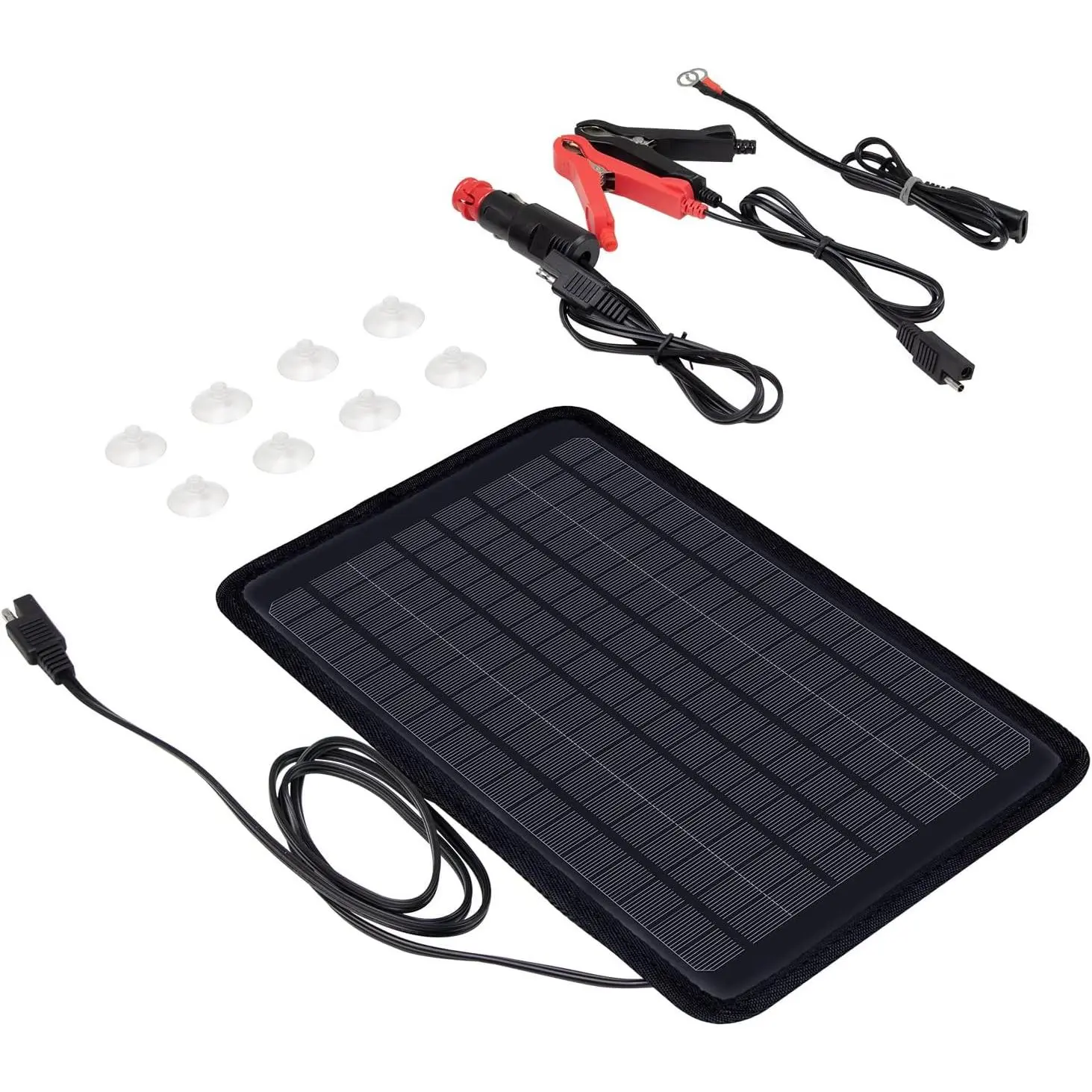 This solar trickle charger comes with a quick SAE connection and 3 options for ring terminals, alligator clips, and cigarette lighters, to charge your batteries or automobiles easily. Suction cups allow the solar trickle charger mounts easily to the windshield or dash.
