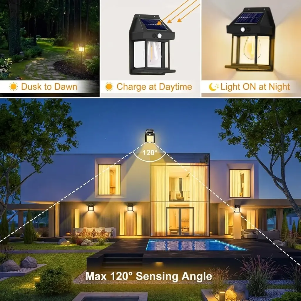 These solar wall lights automatically illuminate your patio, yard, and garage at night. Perfect for enhancing security and ambiance. 🌃