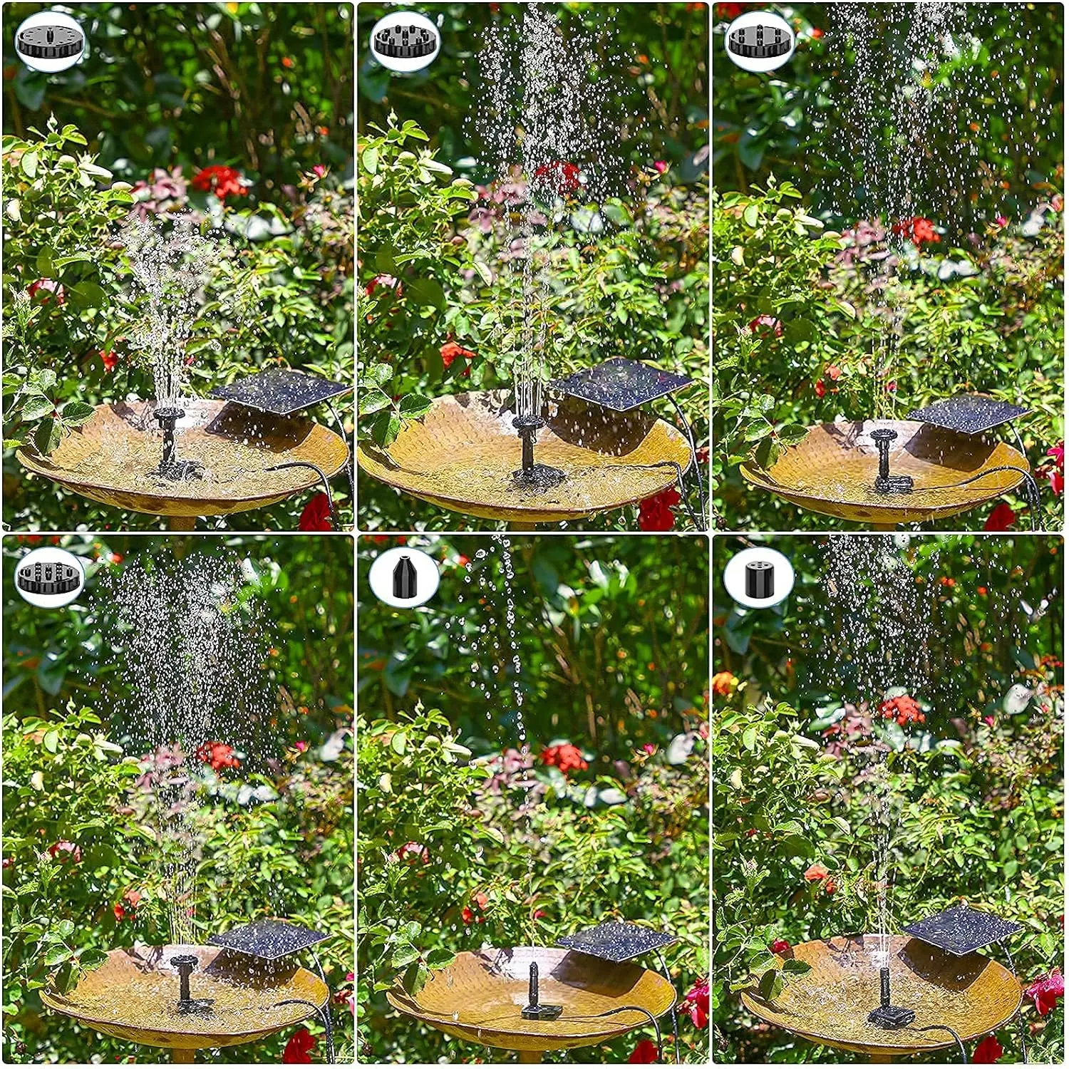 ·[6 Different Water Styles]: This solar bird bath fountain kit comes with 6 different nozzles that can be easily changed to get different jet shapes to prevent water from splashing nearby. It can be attached to a hose to make different water features to suit your good ideas. It is a versatile solar water pump that is perfect for bird baths, fish tanks, small ponds and gardens.