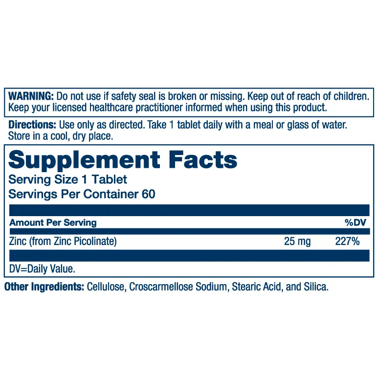·Delivers 25 mg of zinc picolinate—227% DV—for potent immune system, cellular function, skin health, and male reproductive health support*