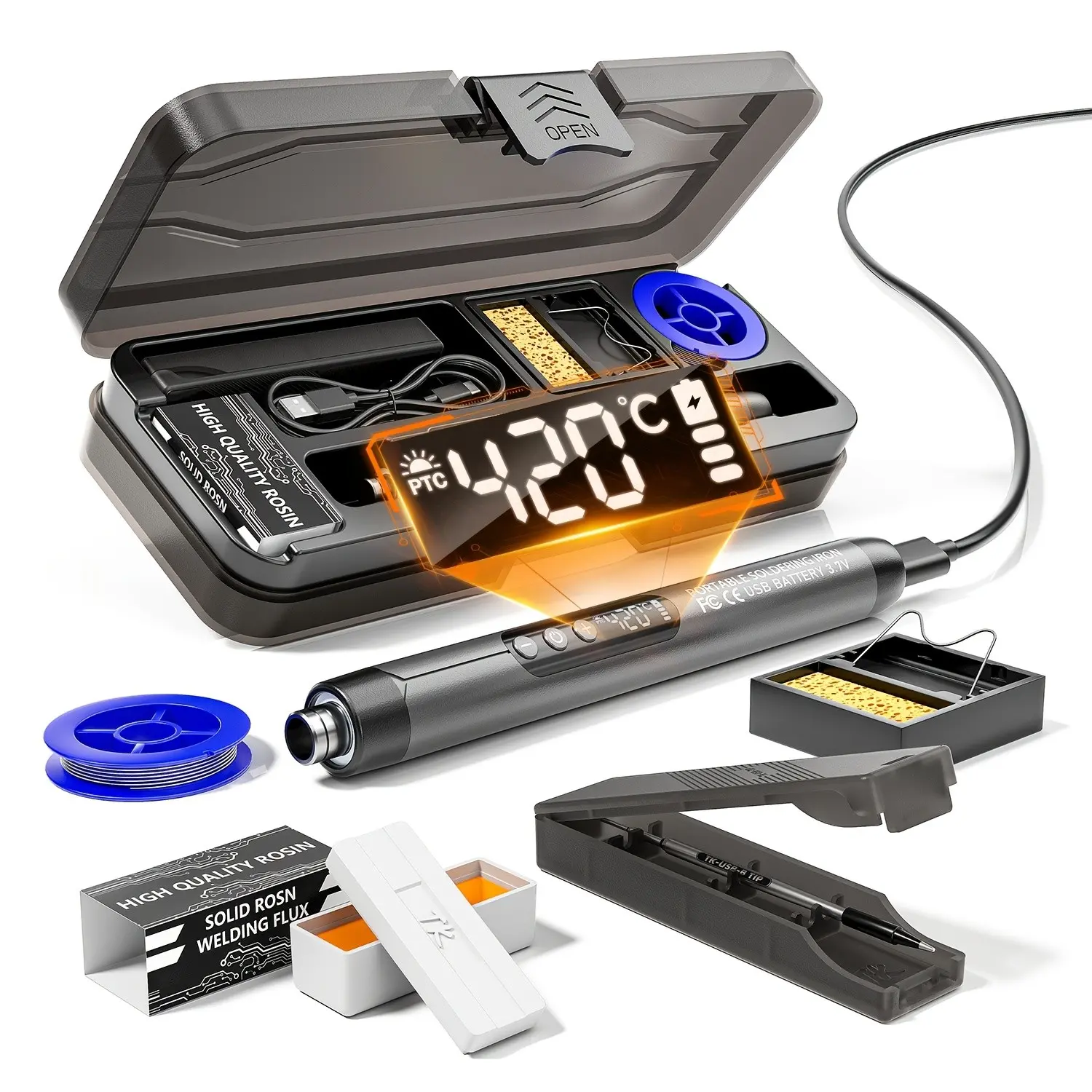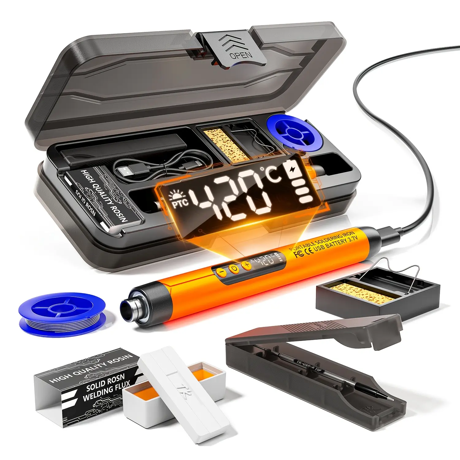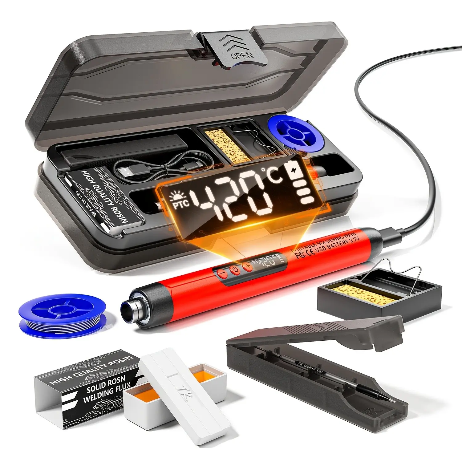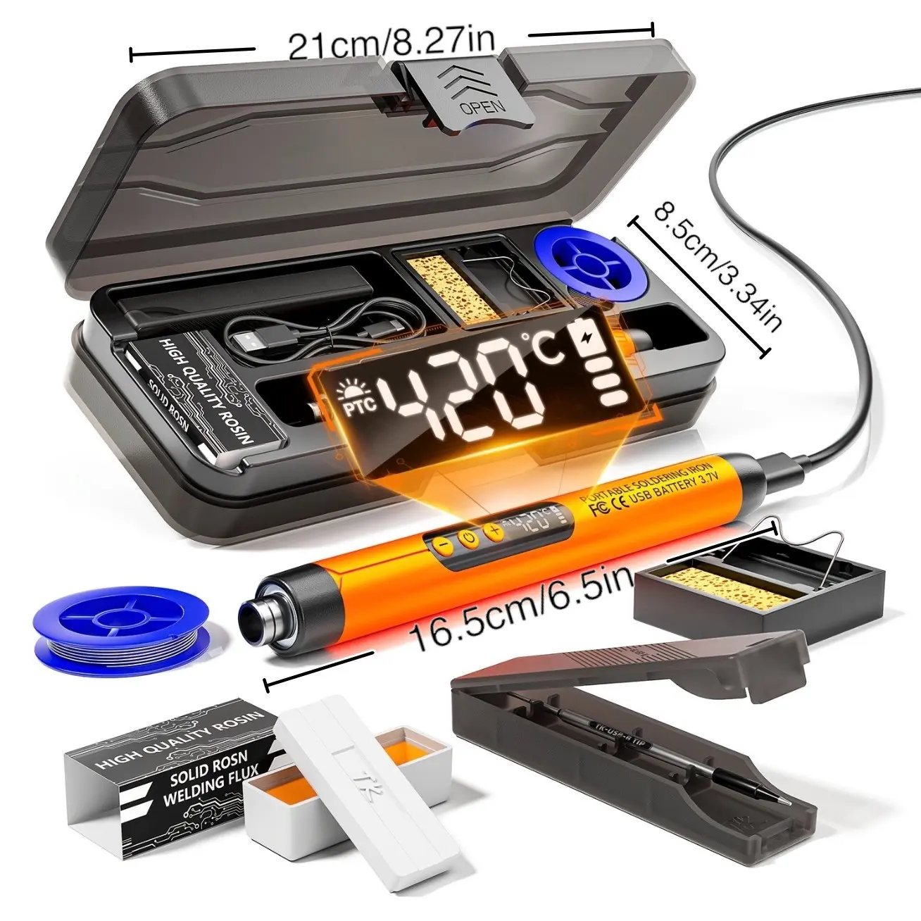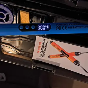 Fast shipping, it came fully charged, only takes a few seconds for it to heat up to over 500°F, comes with flux and solder, a charging cable, a small little sponge and a stand along with the case, very impressed! You have to insert the soldering tip, then hold the power button, Gets hot quite fast!