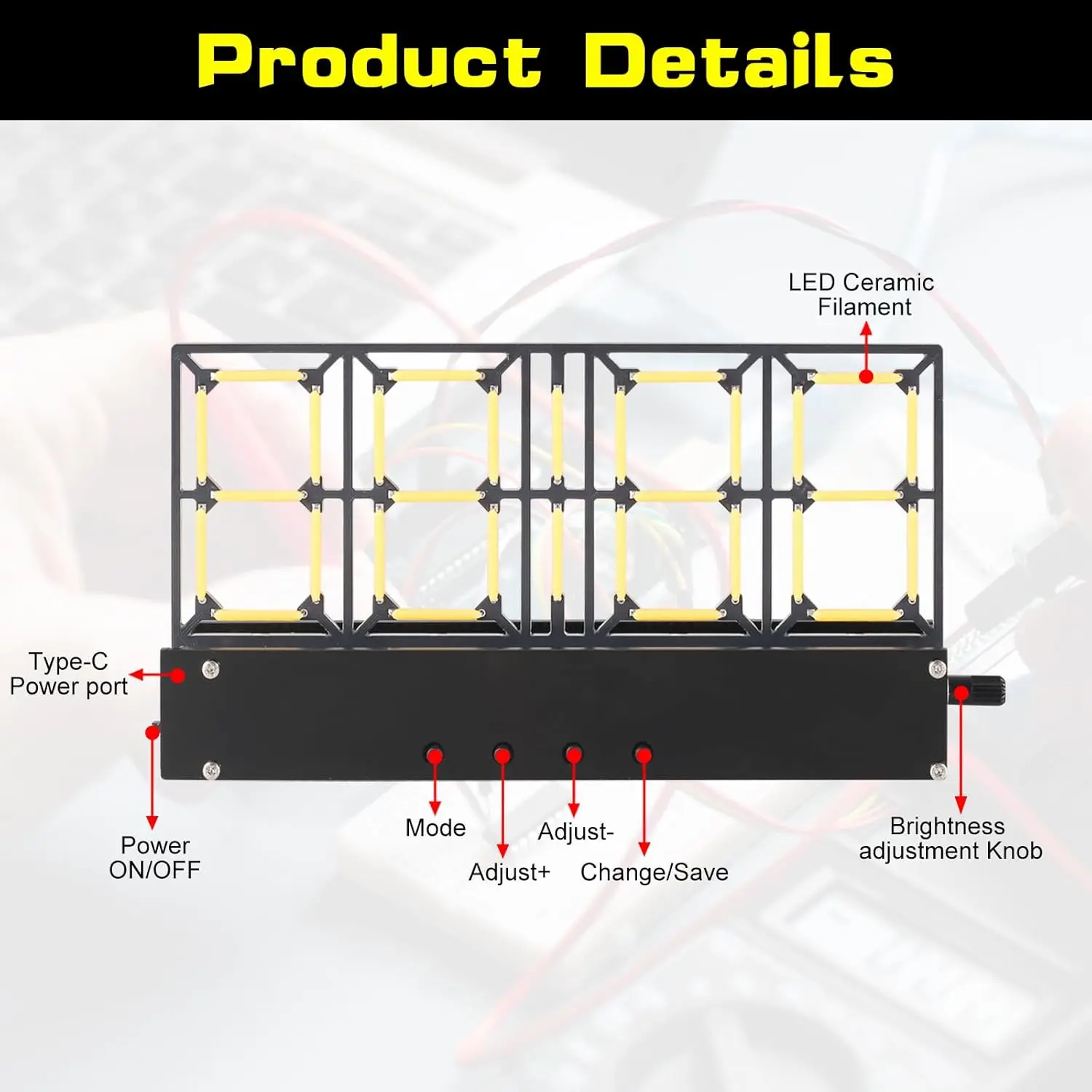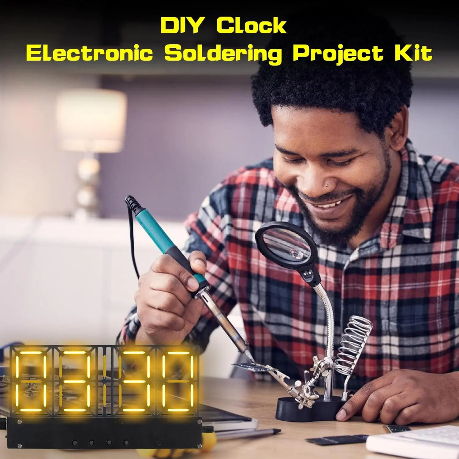 ·UNIQUE CERAMIC FILAMENT: This electronic clock kit utilizes LED ceramic filaments to build 4-digit numbers that emit a soft warm yellow light, and you can adjust the brightness of the light through the knob, whether it's used as a workstation ambient light or a bedside night light to help you sleep, it can infuse your space with a retro tech aesthetic