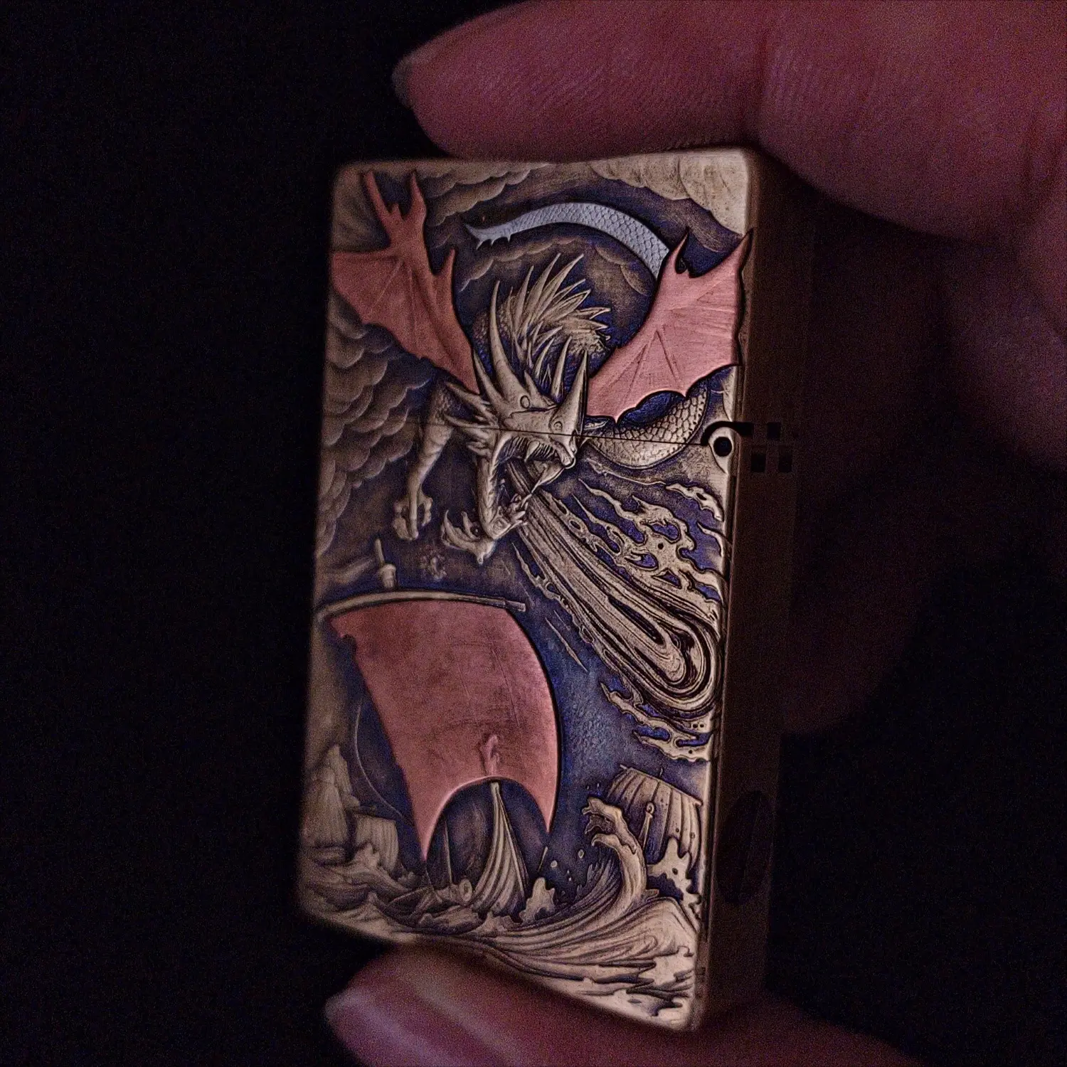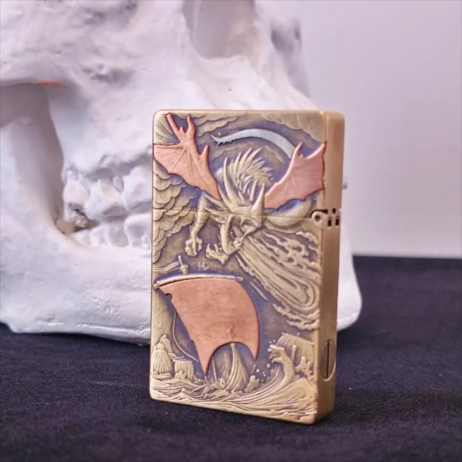 This pure copper lighter features antique double-sided relief carving craftsmanship, making it a premium collectible. Resembling an exquisitely carved miniature suit of armor, it serves as an ideal gift or heirloom. Its seamless body construction ensures durability while showcasing distinctive style. For those who appreciate fine craftsmanship, this lighter stands out with its unique design.