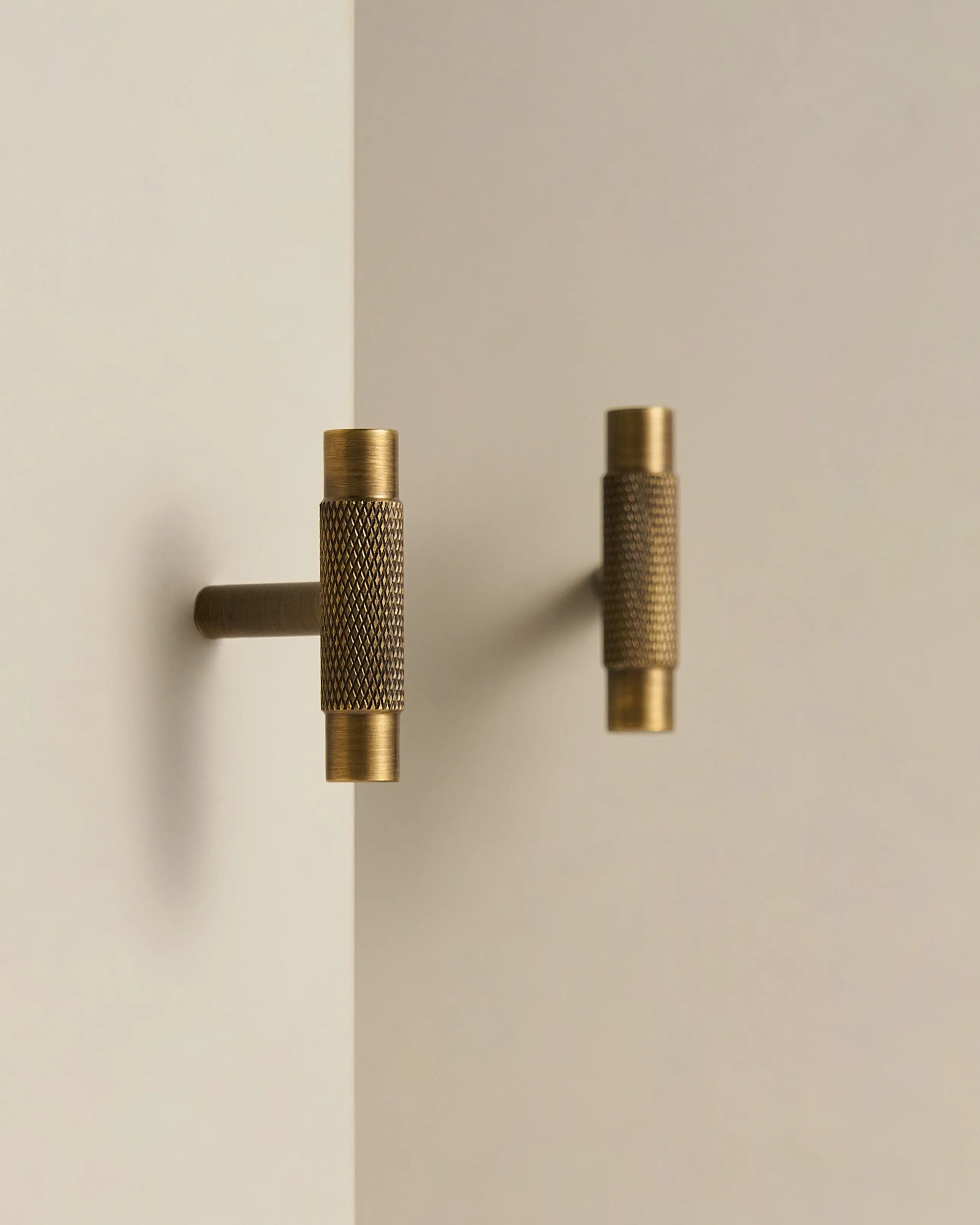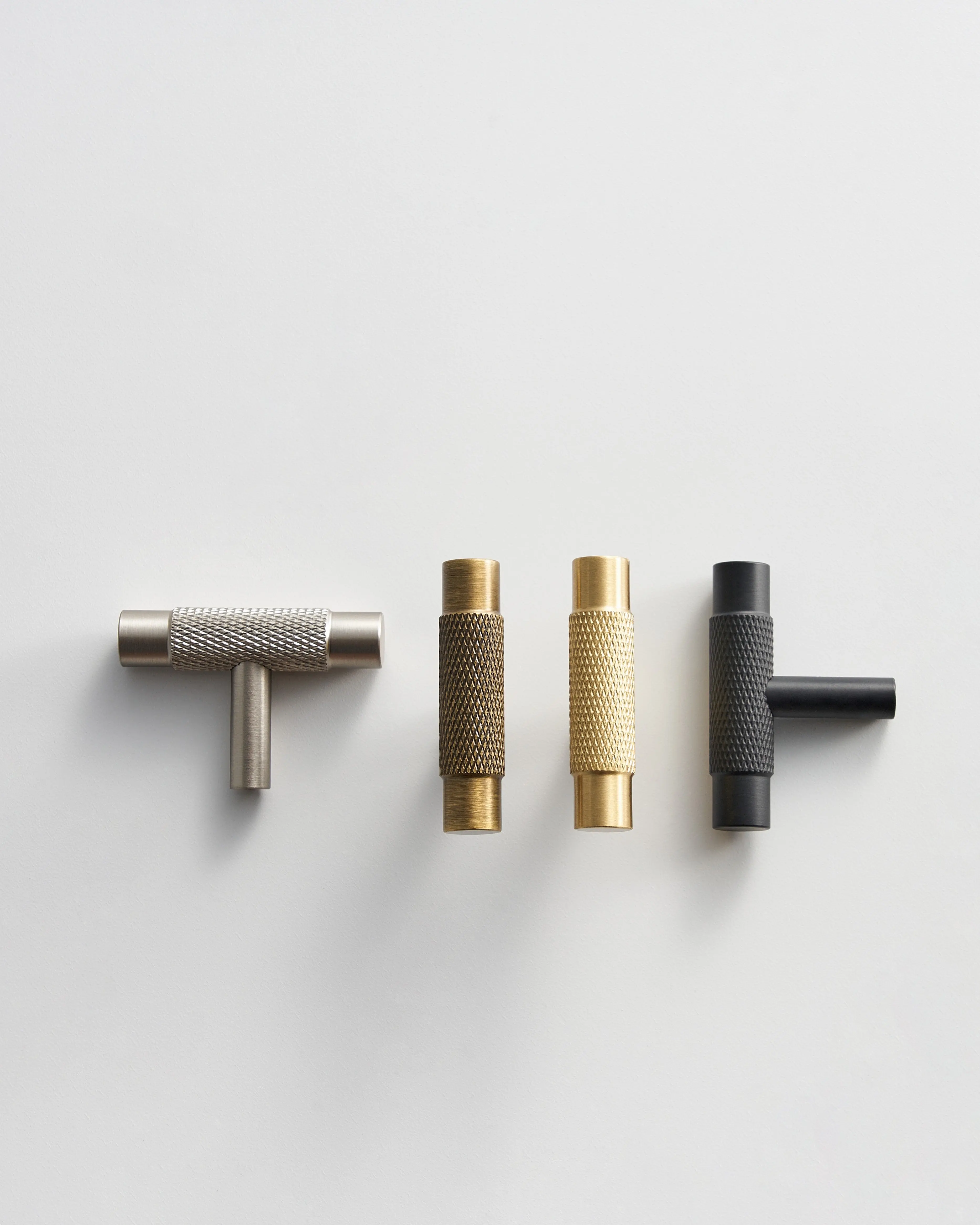 Part of the Kenswick Collection, this solid brass T-Bar knob brings an industrial edge to refined interiors. Its cylindrical form features finely diamond-knurled texture for enhanced grip and tactile appeal, anchored by a clean round base for a polished finish. The minimalist silhouette and precision detailing make it a versatile accent for kitchens, vanities, and built-in cabinetry.