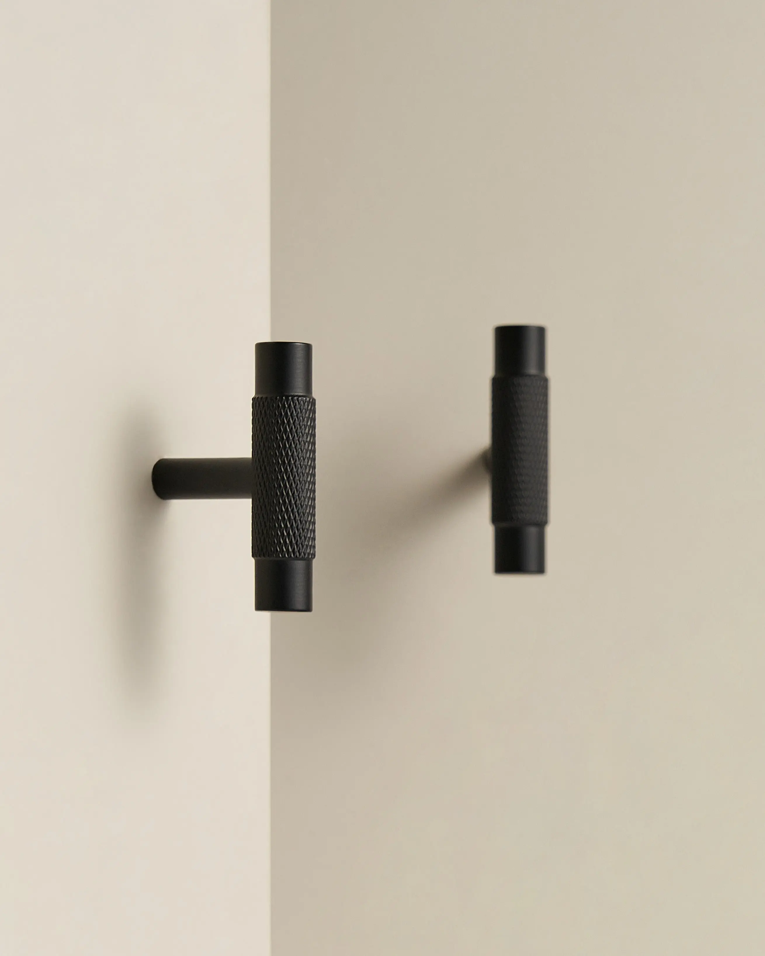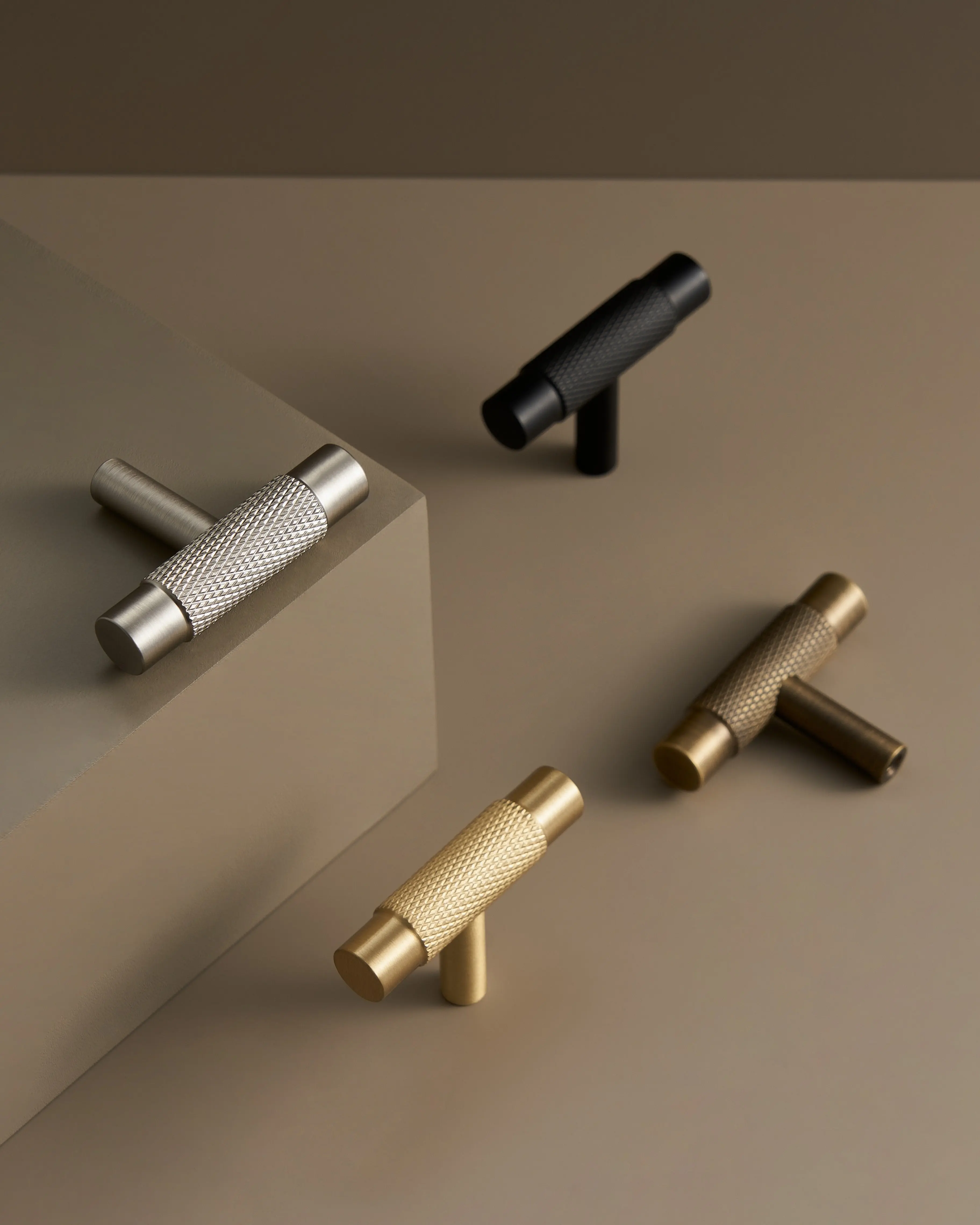 Available in Brushed Brass, Matte Black, and Brushed Nickel, each finish offers a distinct visual tone—whether you're aiming for warm contrast, bold depth, or cool neutrality. The Kenswick T-Bar knob coordinates effortlessly with matching pulls from the same collection to create a cohesive hardware statement.