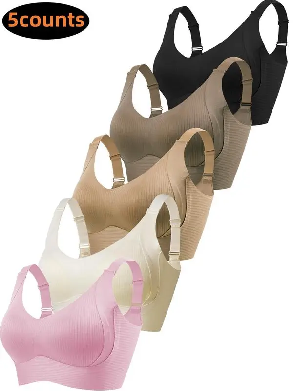 5/6Pack Solid Color Push Up Wireless Bra, Comfortable Breathable Lingerie For Everyday Wear