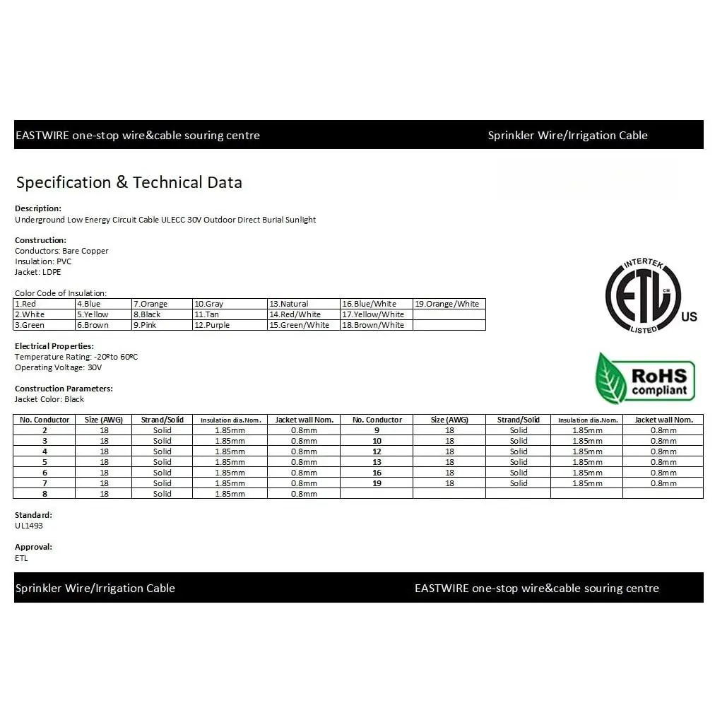 Quality Material: The sprinkler wire is made of solid bare copper wire conductor, special PVC compound core wire and PE compound outer sheath. This sprinkler system wire is produced with quality materials.