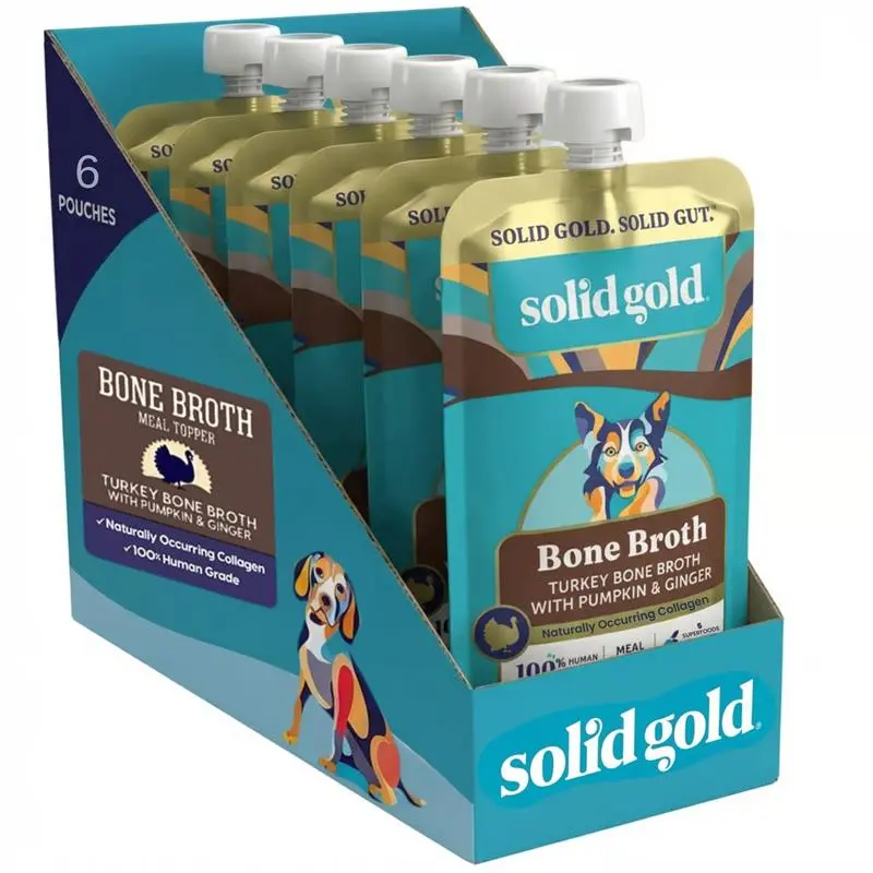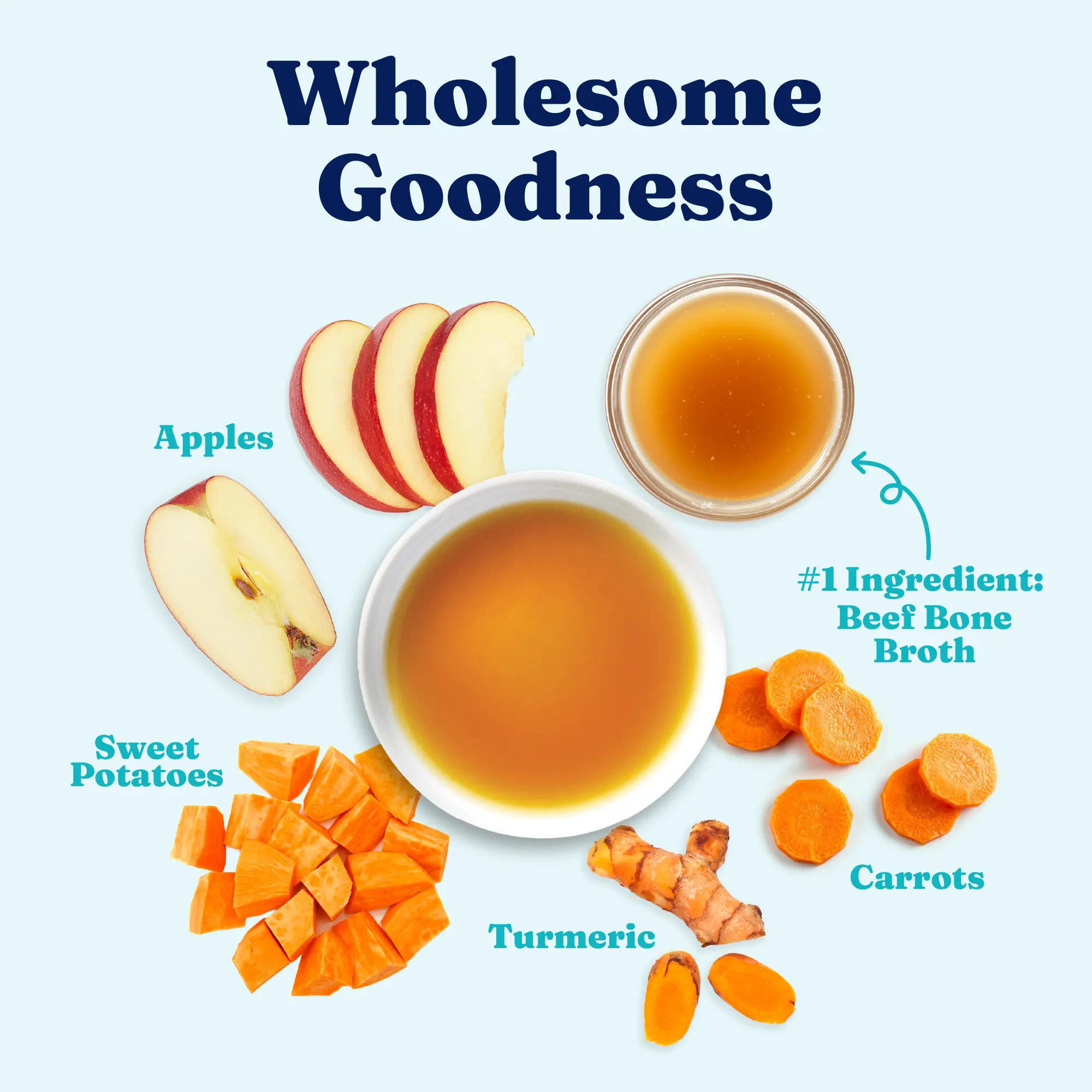 Solid Gold Beef Bone Broth for Dogs is a functional, nutrient-rich food topper made to support hydration, flavor & gut health. This slow-simmered bone broth is made with real beef bones & enriched with superfoods like pumpkin, carrots, ginger, apples & sweet potatoes. It’s a tasty & aromatic addition to your dog’s daily routine—whether served as a warm broth, a kibble sauce, or a standalone treat. This liquid dog food topper is loaded with naturally occurring collagen, which supports joint health, skin & coat wellness. Perfect for senior dogs or picky pups, this pour-over dog food enhancer adds irresistible flavor & moisture to dry food. Plus, the inclusion of turmeric adds an antioxidant-rich boost to support your dog’s overall vitality. Easy to use & highly versatile, Solid Gold's bone broth can be poured over any dry kibble, mixed into wet food, or added to water to encourage hydration—especially helpful for dogs with sensitive teeth or hydration concerns. Use as a daily dog food gravy, dog meal topper, or even as an emergency hydration source. Whether you're searching for dog toppers for dry food, dog seasoning for food, dog food seasoning, dog meal toppers, dog toppers for picky eaters, dog toppers, dog food additive for nutrition, dog food gravy toppers for dry food, dog food additives, dog food gravy topper, dog meal topper, meal toppers for dogs, kibble sauce for dogs, puppy food toppers for dry food, puppy food topper, dog broth, dog gravy, dog gravy topper for dry food, broth for dogs, dog food additives, beef broth for dogs, bone broth dogs, kibble sauce, dog broth for dry food, beef bone broth for dogs, gravy dog food toppers, dog hydration, or gravy for dog food—when it comes to dog food toppers for picky eaters & functional hydration, Solid Gold’s bone broth goes beyond the bowl—nourishing from the inside out.