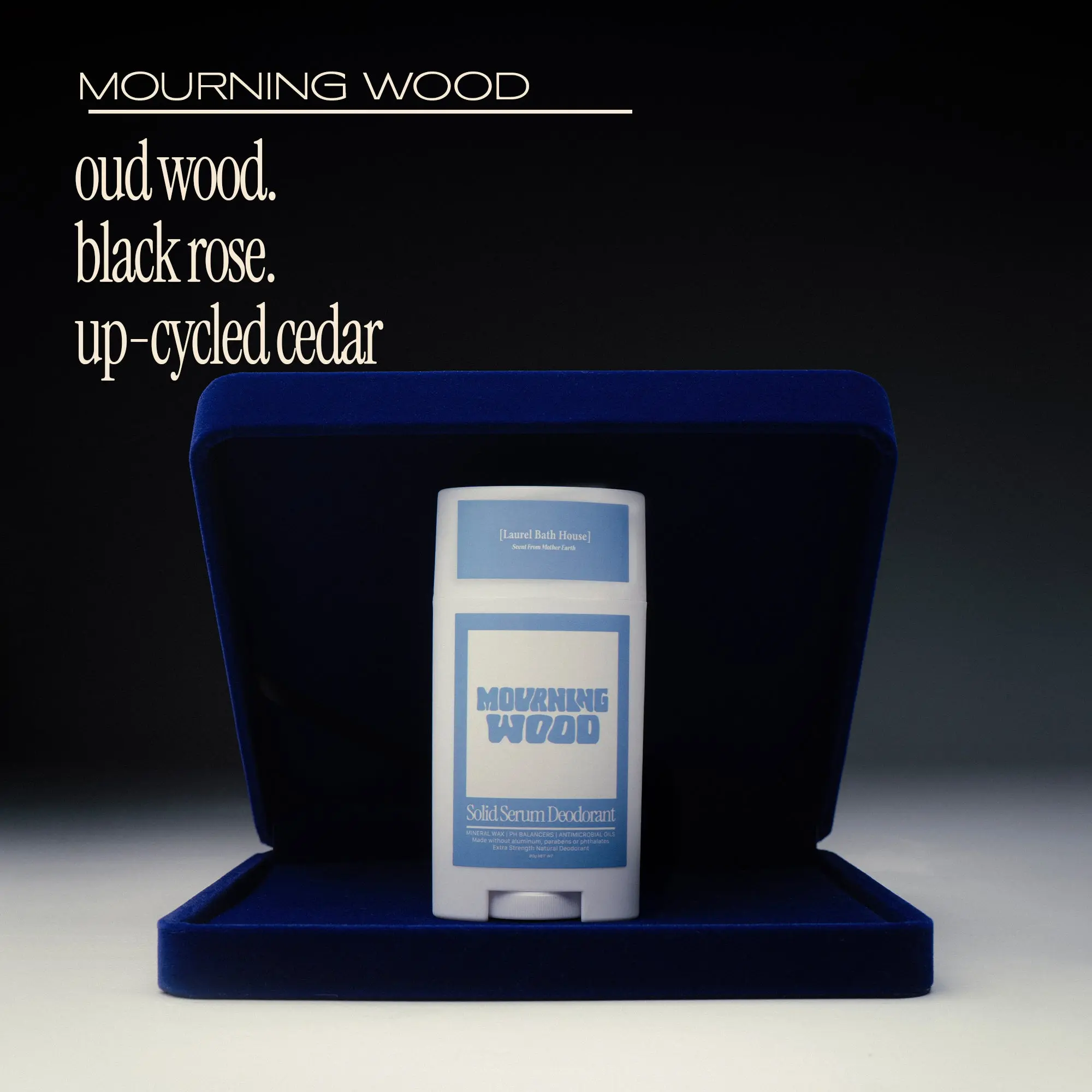 Meet Mourning Wood, the solid serum deodorant that makes natural sexy. Oud wood, black rose, cedar, plus skin-repairing botanicals for 72-hour protection.