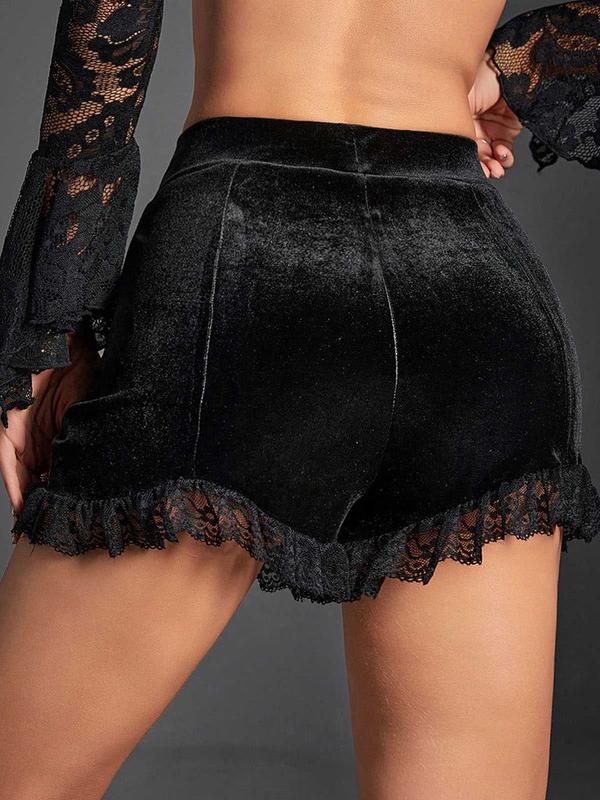 ·Image Description: The attached image shows the shorts in black, featuring a solid velvet fabric with lace detailing and a pleated design.