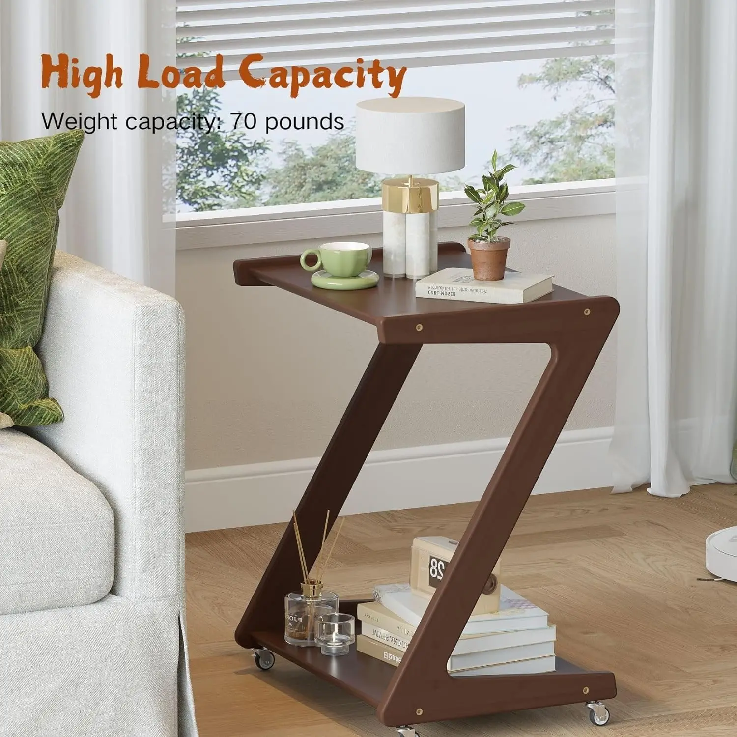 Solid End Table with 2-Layer Storage Shelves, Small Rolling Side Table Beside Couch, Night Stand for Sofa, Coffee, Bedroom, Living Room (Z Shape, Walnut)