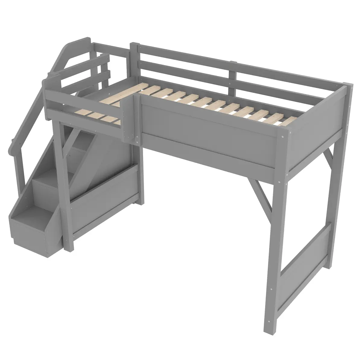 Transform your child’s bedroom with this twin size loft bed with built-in wardrobe and storage space, a smart and stylish solution for maximizing space in modern homes. Designed with a raised sleeping area, the loft structure frees up the lower space for an integrated wardrobe and additional storage zones-perfect for clothes, toys, books, and daily essentials. Crafted from solid wood, the bed frame is sturdy, durable, and built for long-term use. Full-length guardrails surround the upper bunk to ensure safe sleep, while the secure, easy-to-climb stairs offer stable access for kids. Beside the sleeping area, convenient bedside shelves provide a functional spot for nighttime items, helping keep the bed organized and comfortable. Thanks to the included tools and step-by-step illustrated instructions, assembly is simple and beginner-friendly. With its clean gray finish and multifunctional design, this loft bed delivers safety, durability, and excellent storage-all while enhancing the look and feel of any bedroom.