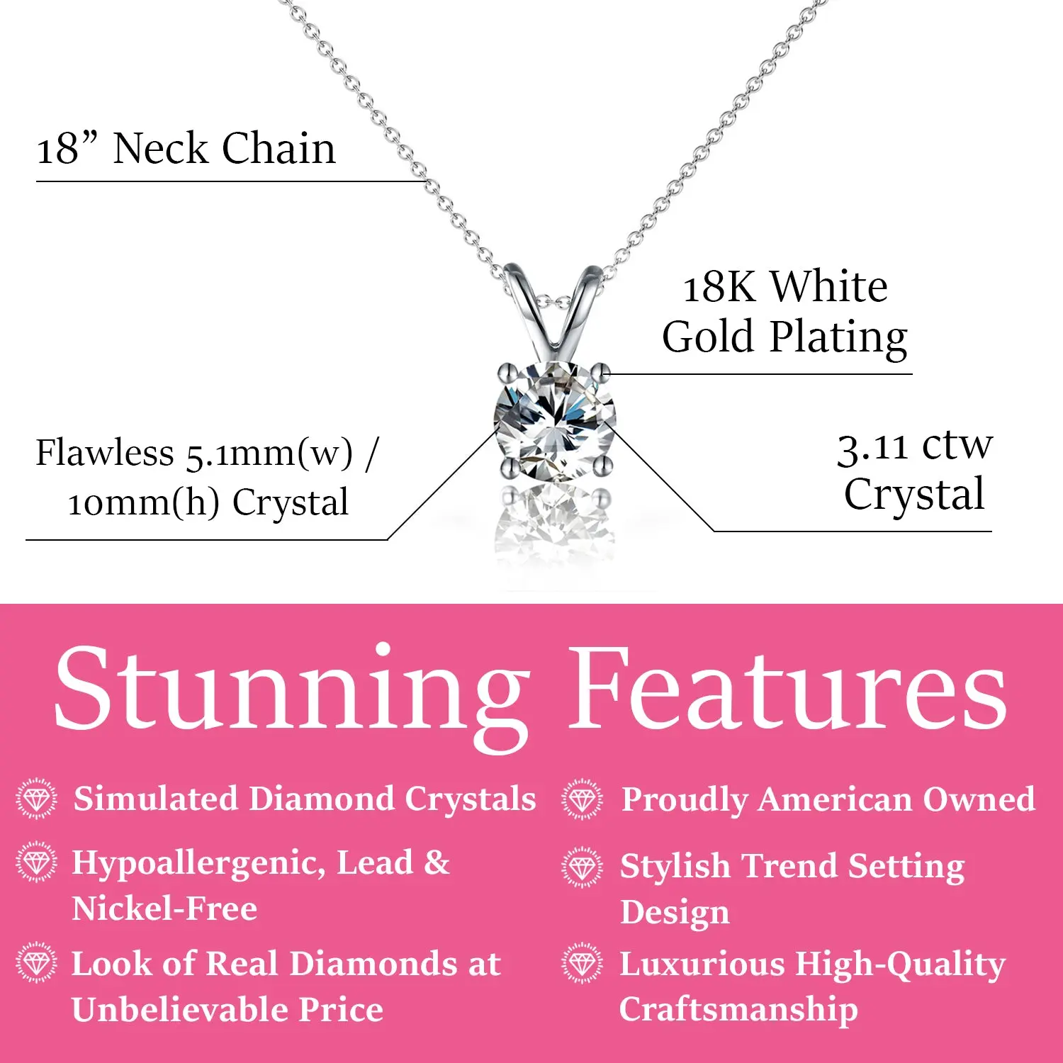 Introducing the Faye 18k White Gold Plated Solitaire Necklace – a dazzling fusion of elegance and sophistication. Impeccably crafted with 18k white gold plating, this silver necklace for women boasts a radiant Swarovski Crystal, capturing attention with its 5.1mm width and 10mm height. The 18" cable chain enhances the feminine allure, while the lobster clasp ensures a secure closure.
