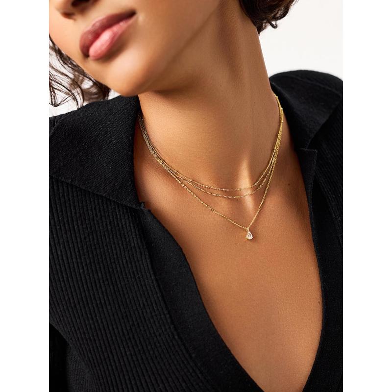 The delicate solitaire pendant with a pear-shaped cubic zirconia gemstone set in prongs gives this gold chain necklace an elegant touch. Dipped in 14K gold and with a subtle sparkle, this necklace creates an updated look for any outfit and can be worn alone or layered with other necklaces. Versatile enough to wear with more formal outfits, as well as casual pieces, this delicate solitaire pendant is a must-have this season.