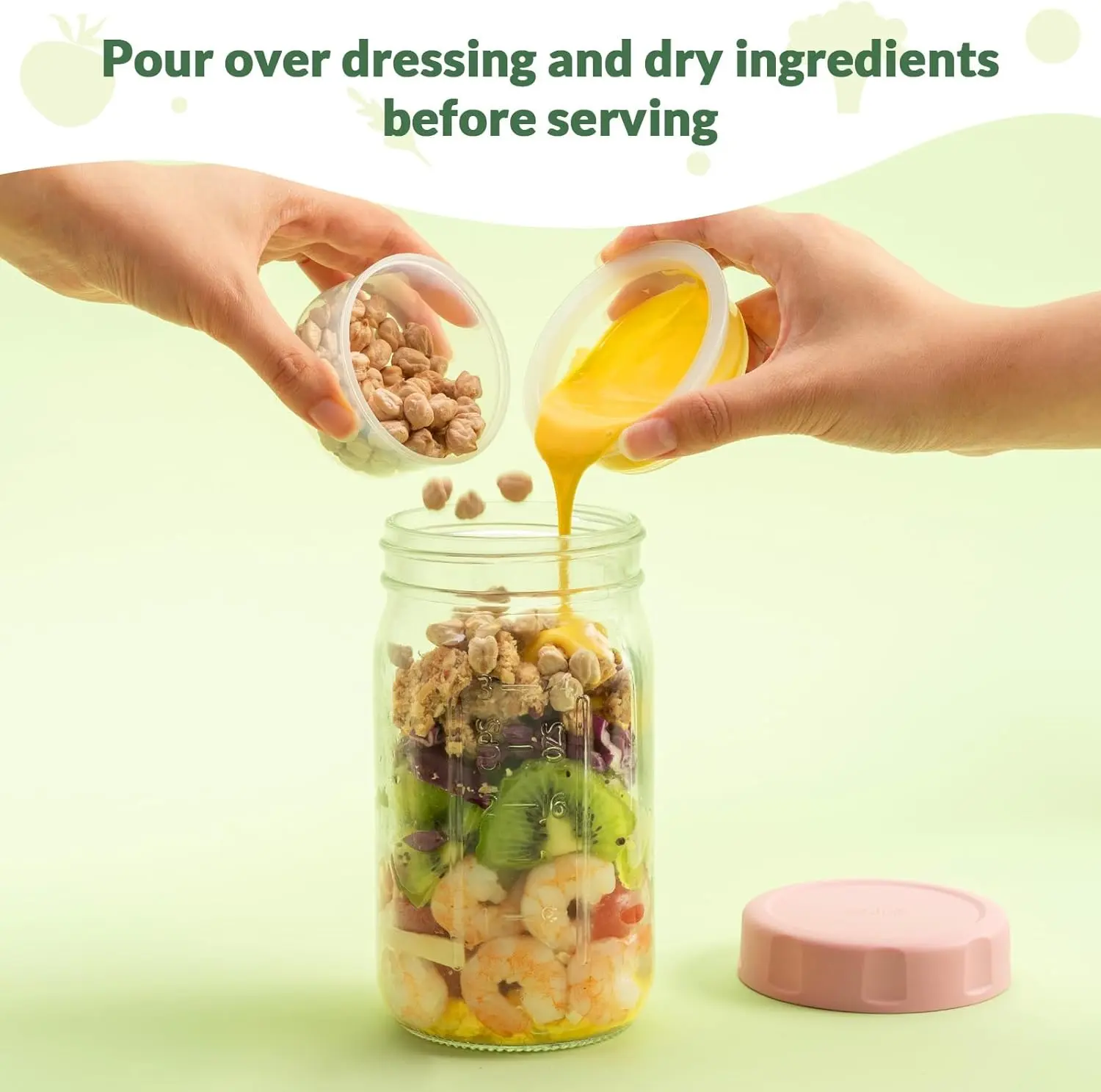 ·Two Serving Scenes to Choose from - You can take the salad jar with lid out of the fridge and pour it into a salad bowl, top with dressing and crunchy beans, stir, and enjoy a bowl of fresh, crisp salad at home; Or take it with you on the go and use it as a salad container for your outdoor picnics or work lunches!