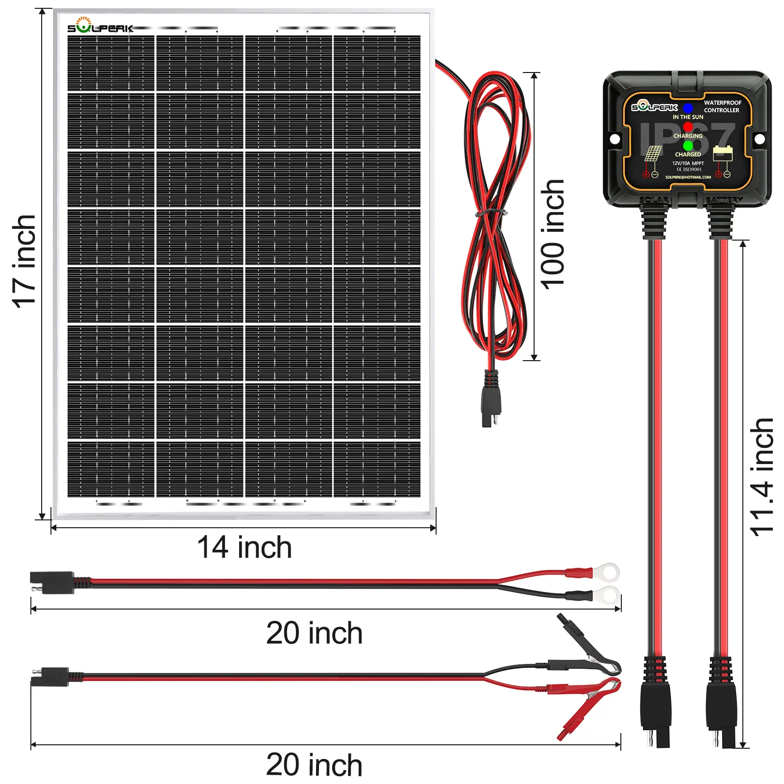 ·ăWhat You Getă 1 solar panel + 1 solar charger controller + 1 alligator clips + 1 SAE extension cable + 2 screws. We provide one year warranty and lifetime technical support. 7Ă24 hours After-sales service ensures that your question is answered within one day.