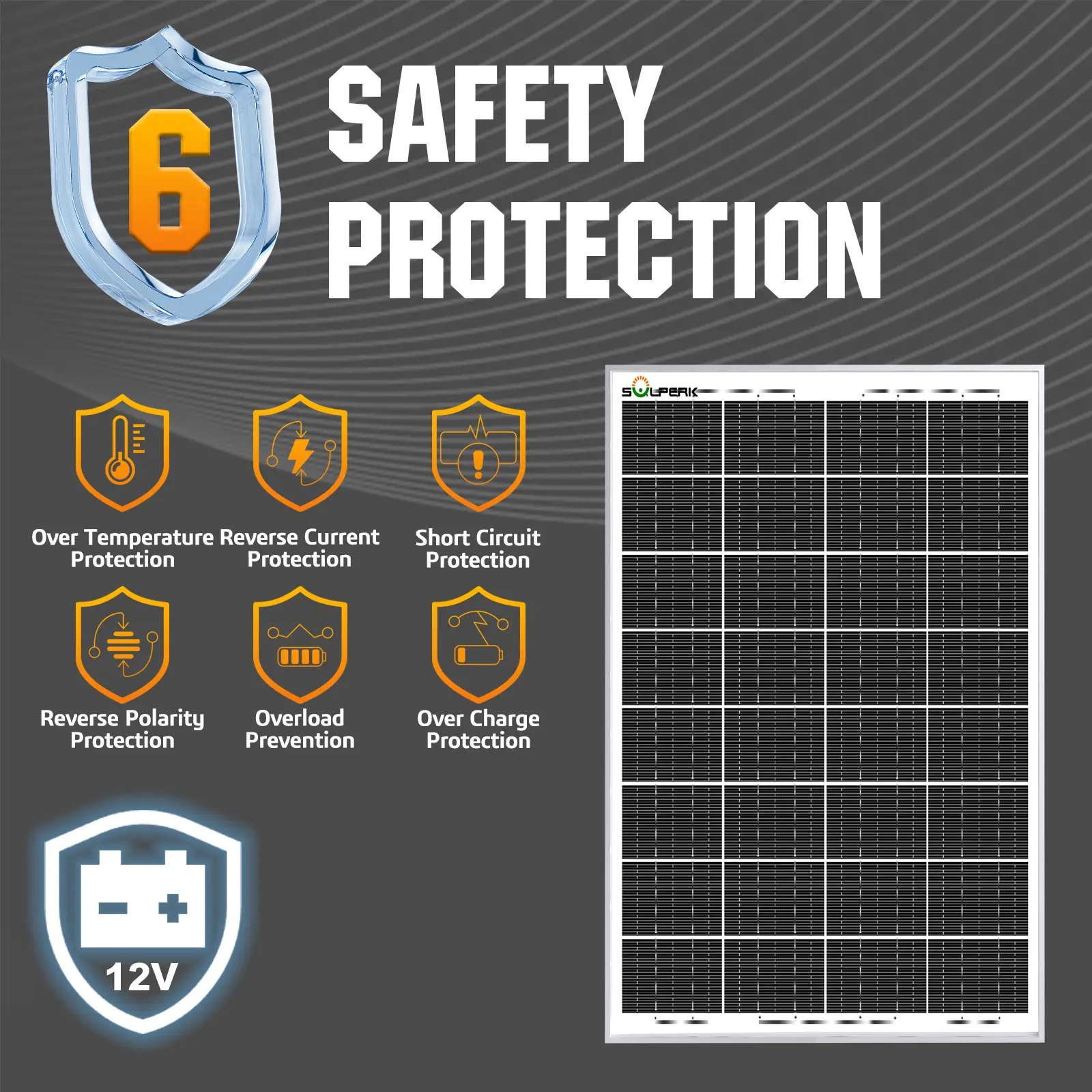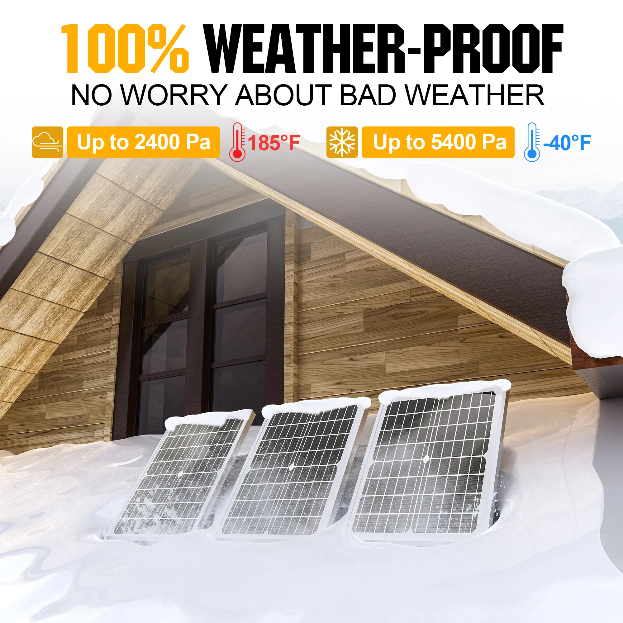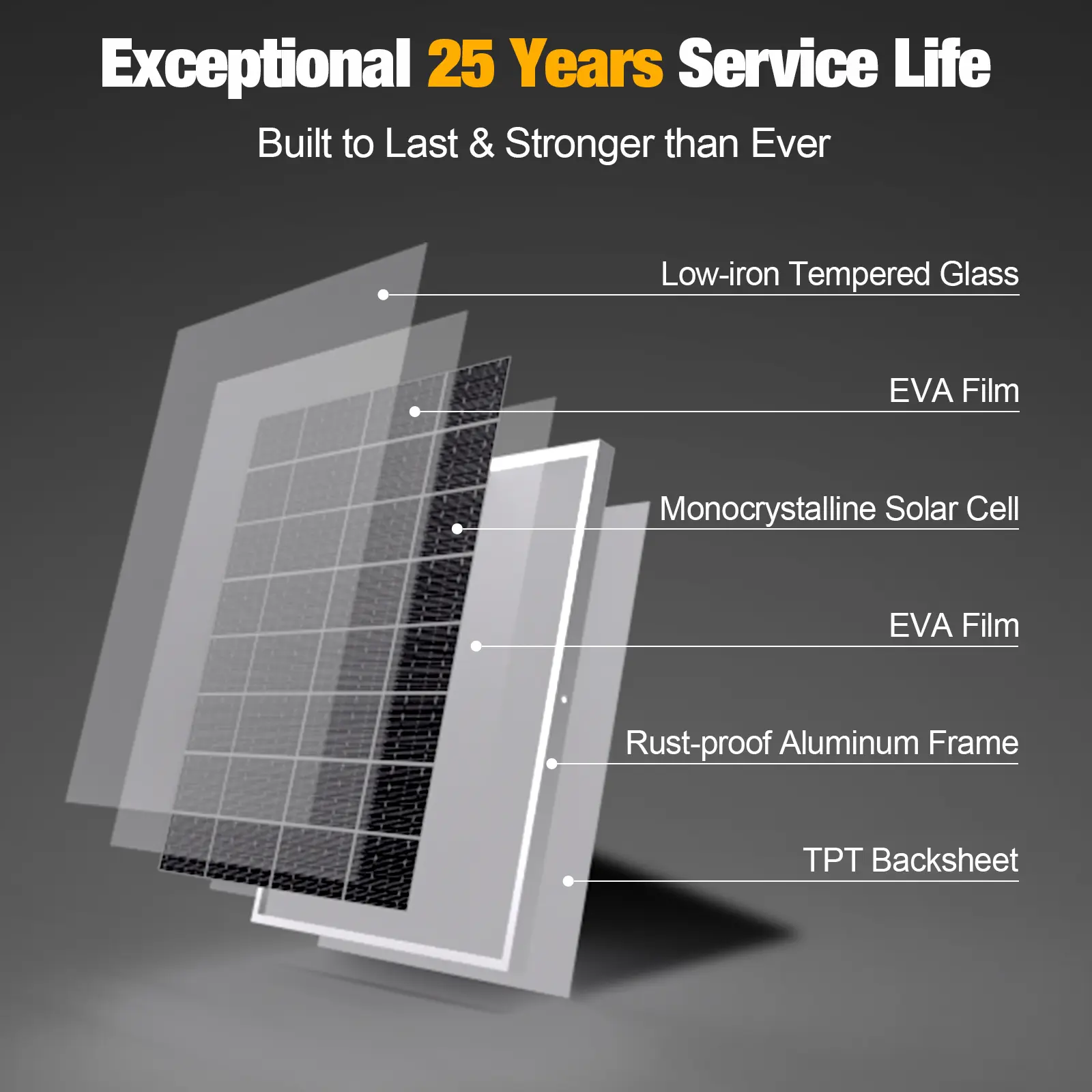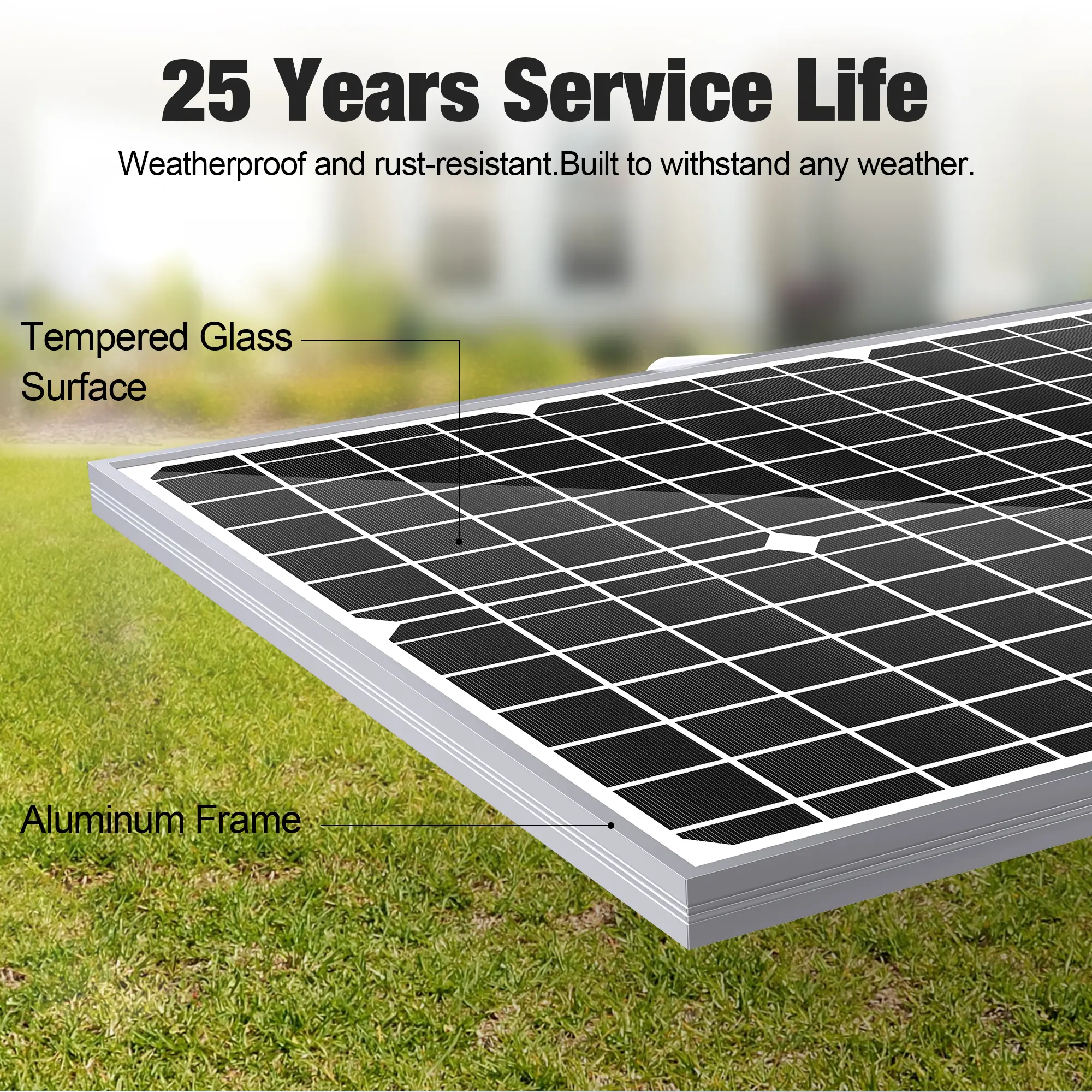 ·ăBuilt to Lastă Low-iron tempered glass surface and corrosion-resistant aluminum frame, make this solar panel 100% waterproof and rustproof, and provide the prolonged lifespan up to 25 years. This 12V solar panel can withstand all weather conditions such as sandstorm, strong wind, thunderstorm, blizzard, hail, etc. It can withstand up to 2400Pa wind pressure and 5400Pa snow load.