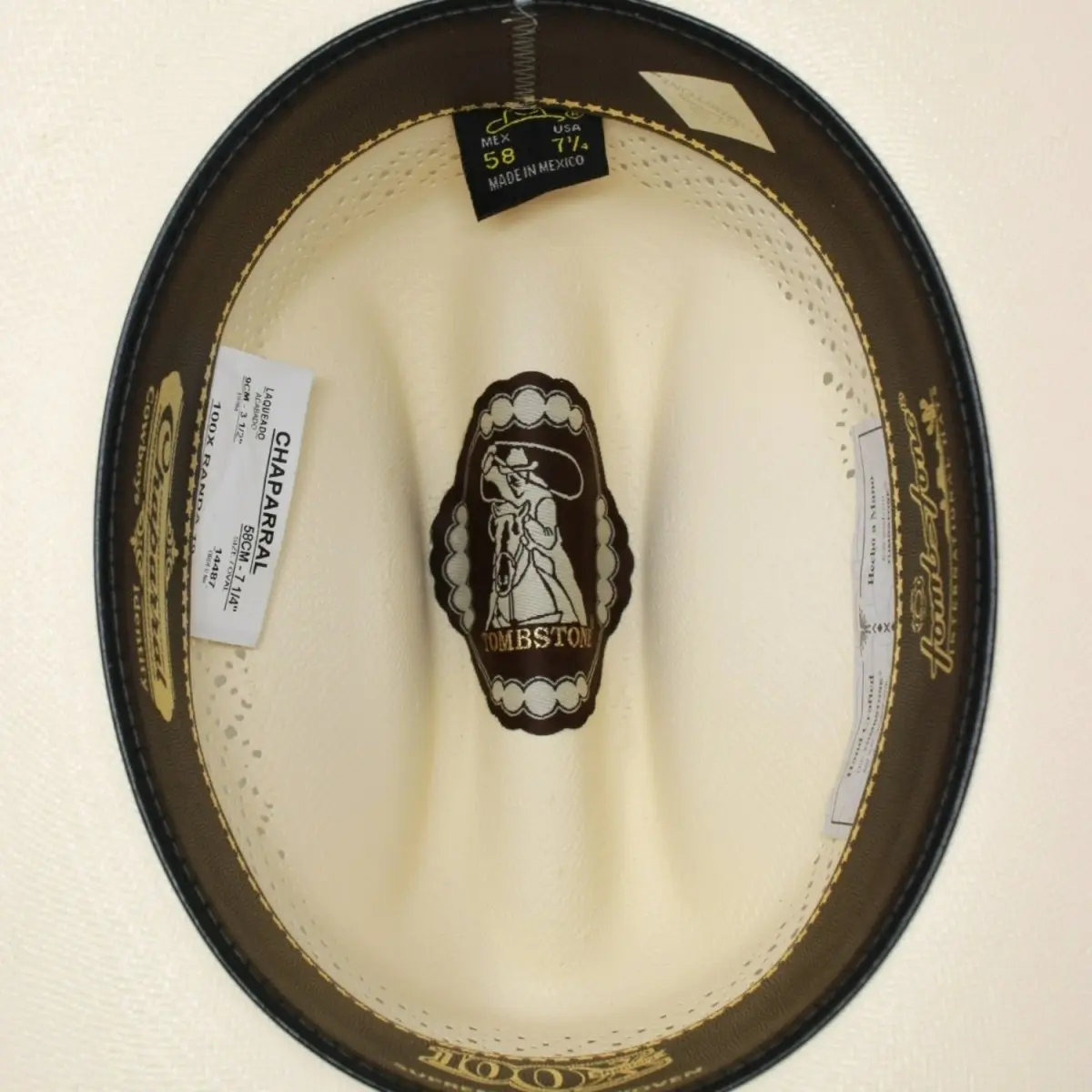 The crown size measures 4 1/2", while the brim spans 3 1/2". These dimensions define the Sinaloa (Chaparral) shape, perfect for those who appreciate authentic styles. The brand, Tombstone, adds a touch of reliability to this classic accessory.