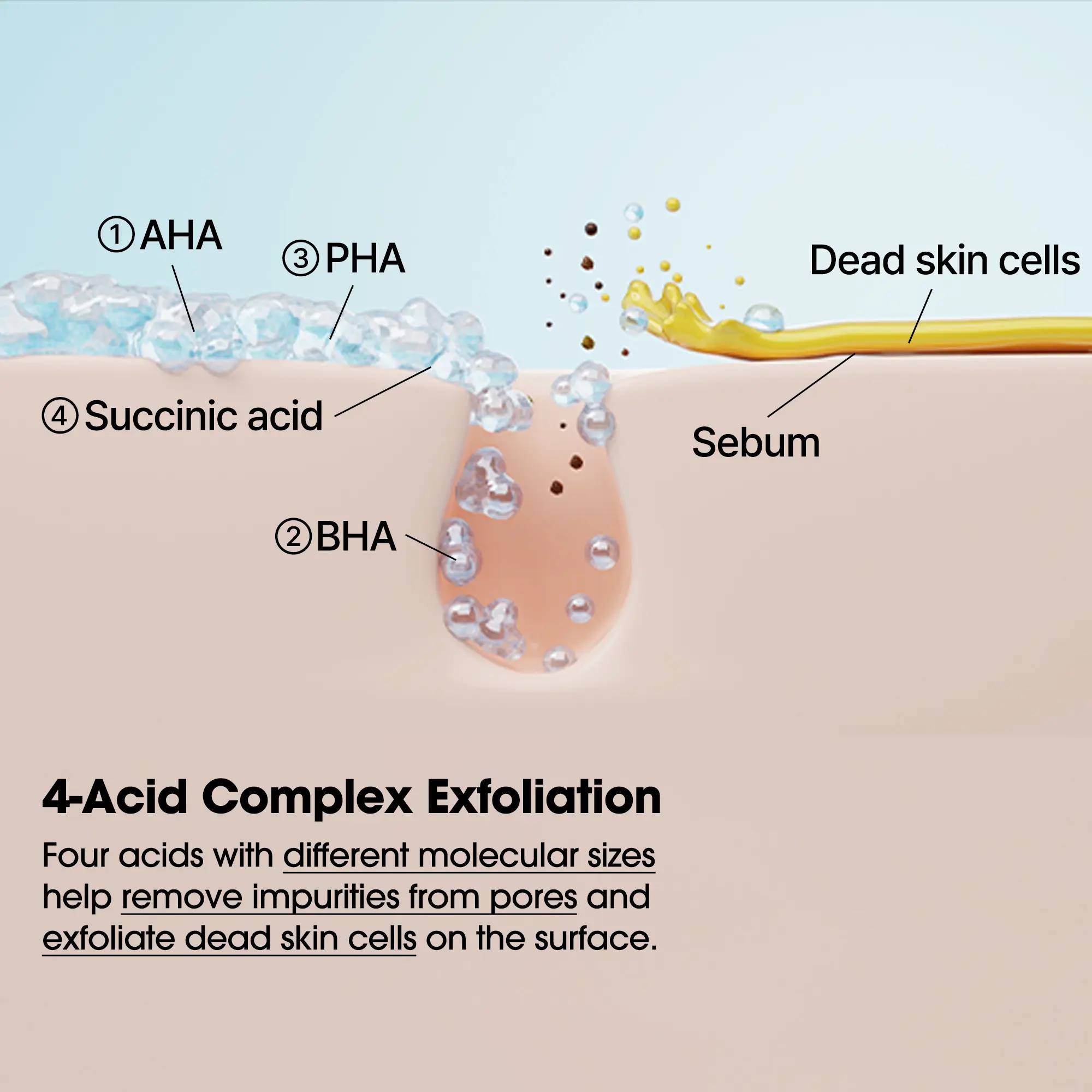 A powerful blend of AHA, BHA, PHA, and Succinic Acid simultaneously targets dead skin cells, excess sebum, and pore impurities to transform rough, "strawberry skin" into a smooth, refined texture.
