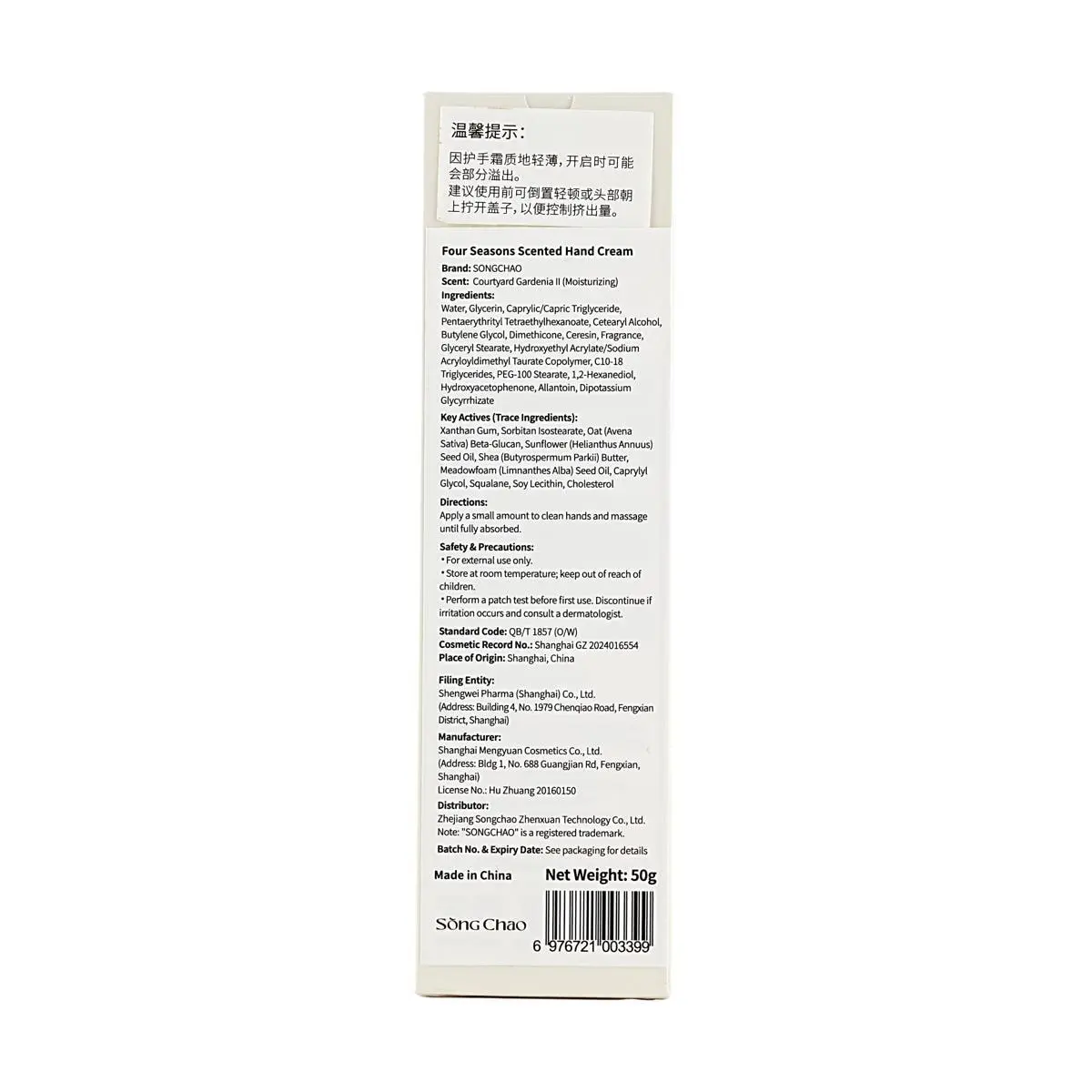SONG CHAO Gardenia Hand Cream 50g - Hydrating & Moisturizing for Dry, Damaged Hands, Sun Repair, UV Protection