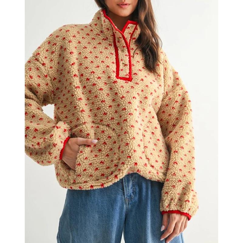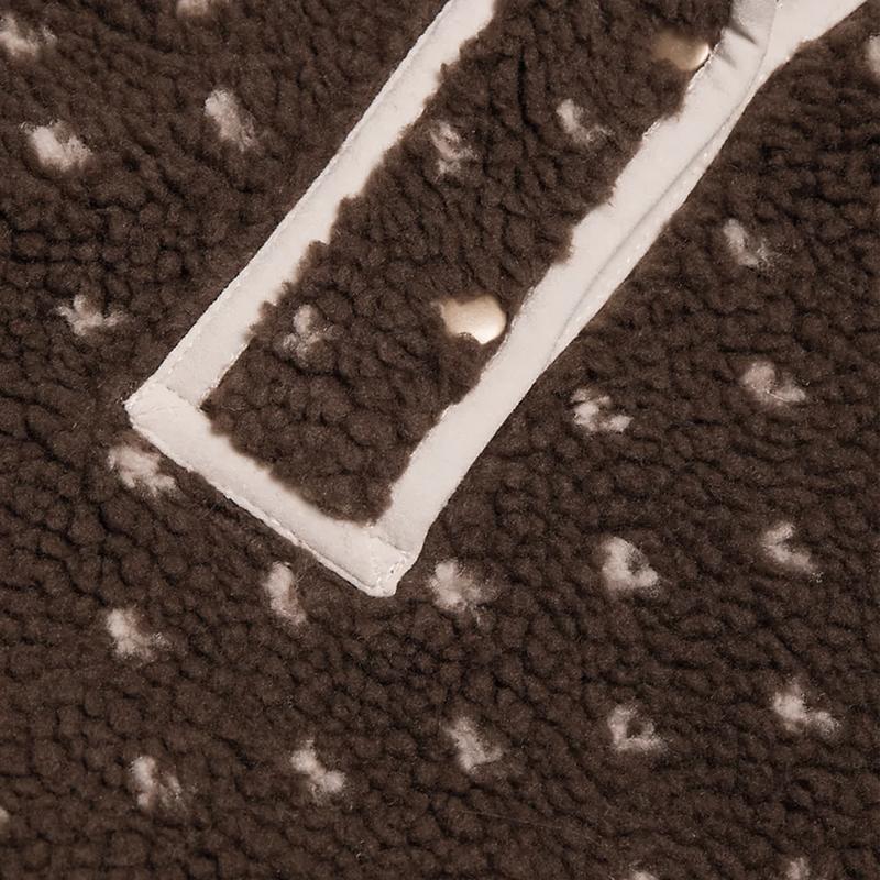 Features: Fashionable Sherpa-lined pullover hoodie with long sleeves. Vintage jacquard print in a heart-shaped check pattern. Funnel neckline with metal snap buttons for easy on/off. Contrast-colored trim along edges. Side zip pockets. High collar design enhances warmth.