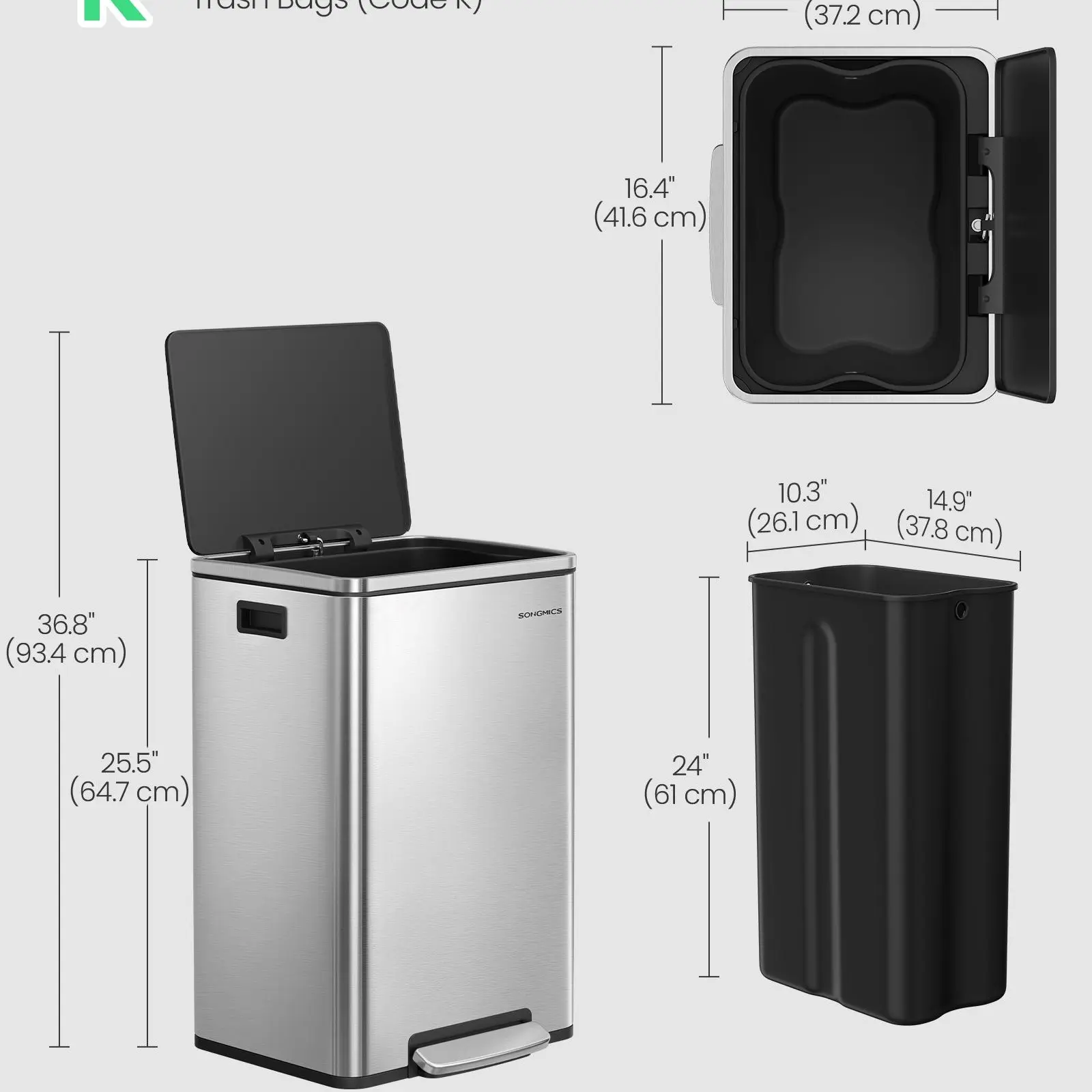 ·Size of Inner Bucket: 14.9"L x 10.3"W x 24"H (37.8 x 26.1 x 61 cm)