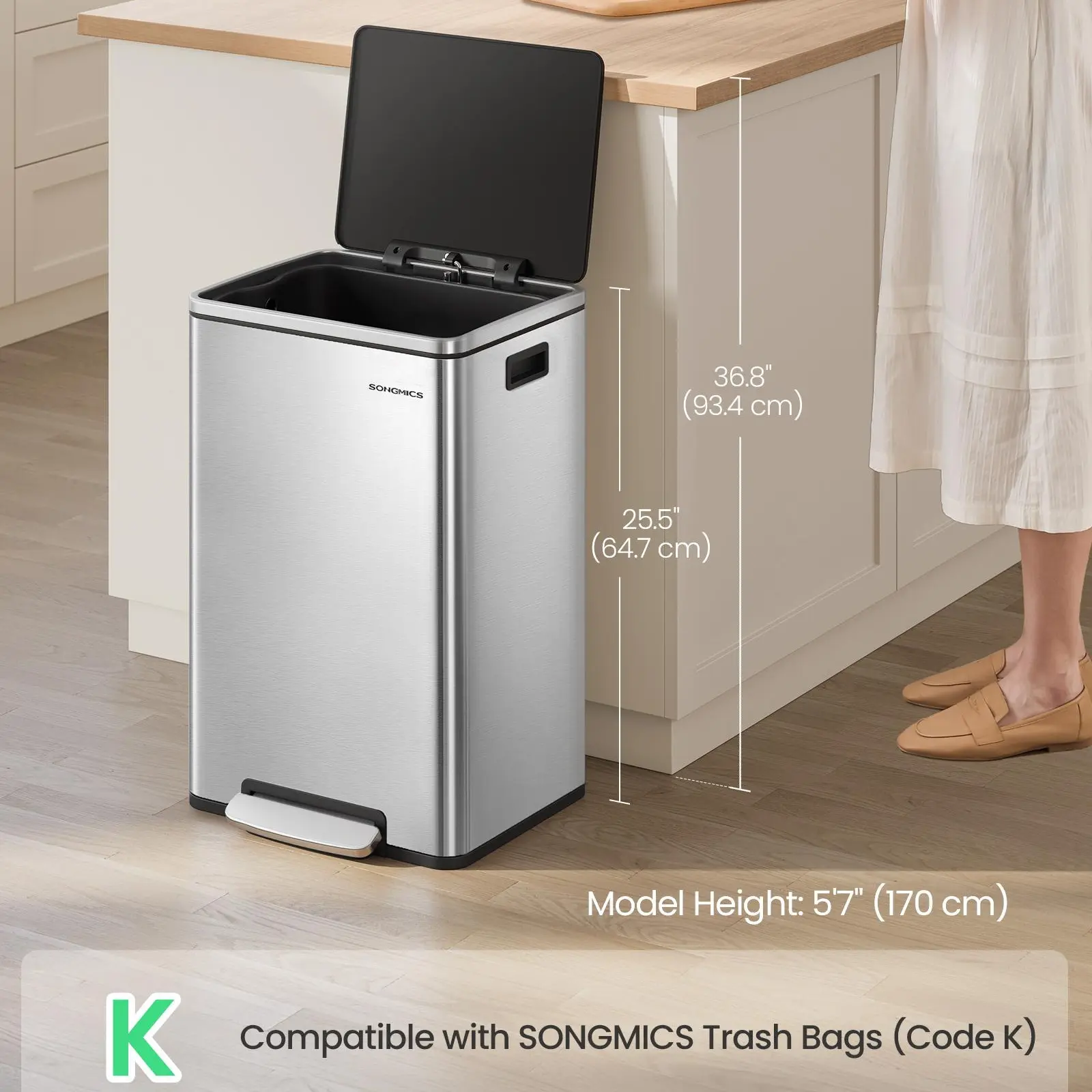 ·Handy Foot Pedal: Allows for hands-free opening of the lid, particularly useful when preparing food or during a big clean-up.