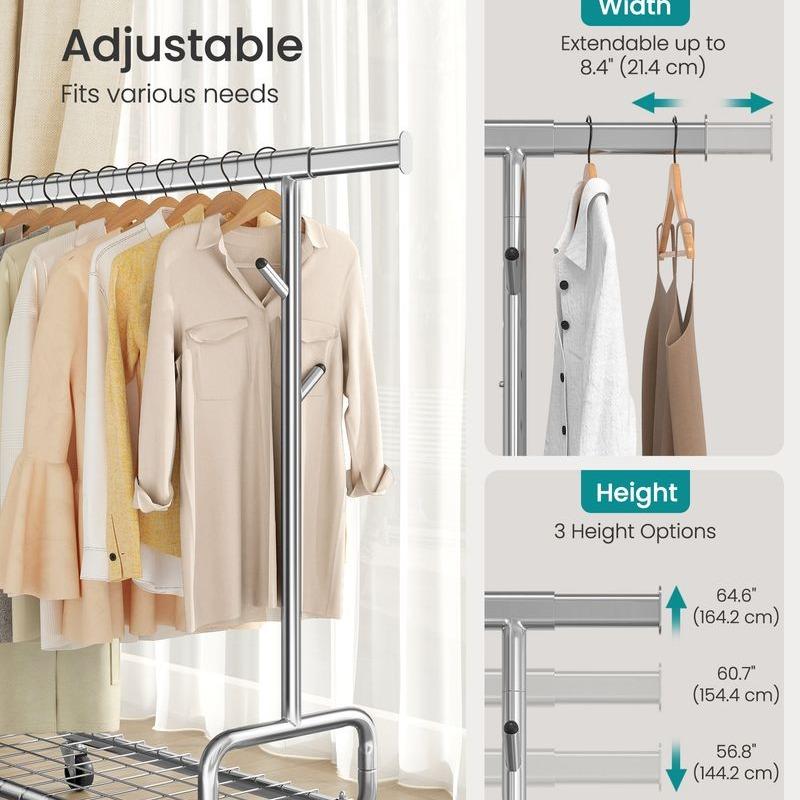 ·Extendable and Adjustable: Extendable hanging rod with 3 height options fits all storage needs.