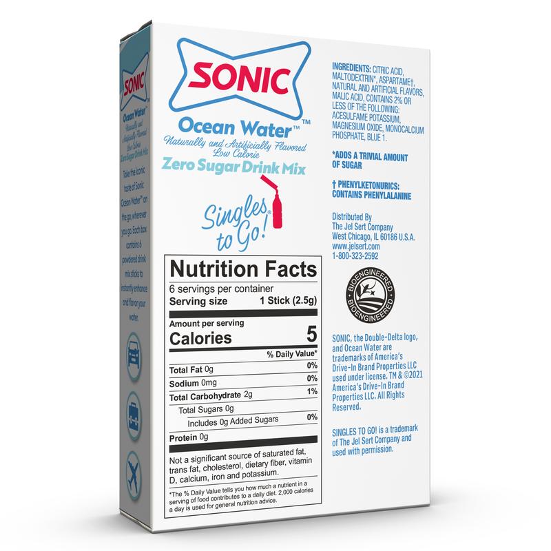 Bring home the taste of SONIC Drive-In with Ocean Water Singles To Go drink mix! Each stick transforms plain water into the sweet, refreshing blue coconut flavor you know and love. These convenient water enhancer packets are sugar free, low calorie, and perfect for on-the-go hydration. Just pour, shake, and sipโenjoy SONICโs iconic drink anytime, anywhere.