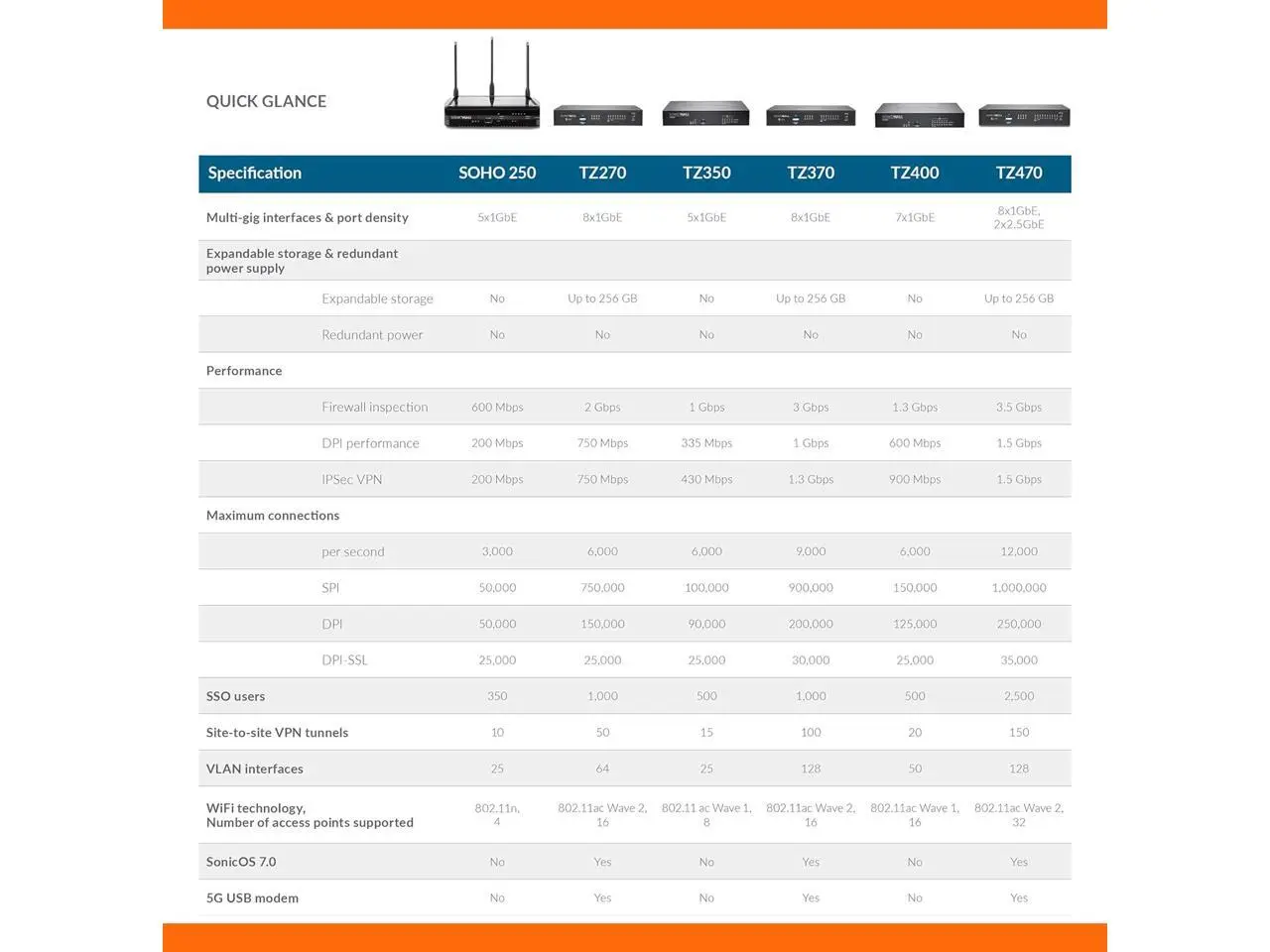 ·The latest SonicWall TZ series, are the first desktop form factor nextgeneration firewalls (NGFW) with 10 or 5 Gigabit Ethernet interfaces. The series consist of a wide range of products to suit a variety of use cases.Designed for small, mid-sized organizations and distributed enterprise with SD-Branch locations, the 7th generation (Gen 7) TZ series delivers industry-validated security effectiveness with best-in-class priceperformance. These NGFWs address the growing trends in web encryption, connected devices and high-speed mobility by delivering a solution that meets the need for automated, realtime breach detection and prevention.The Gen 7 TZ series are highly scalable, with high port density of up to 10 ports. It features both inbuilt and an expandable storage of up to 256GB, that enables various features including logging, reporting, caching, firmware backup and more. An optional second power supply provides added redundancy in case of failure on select models.Deployment of Gen 7 TZs are further simplified by Zero-Touch Deployment, with the ability to simultaneously roll out these devices across multiple locations with minimal IT support. Built on next-gen hardware, it integrates firewalling, switching and wireless capabilities, plus provides single-pane-of-glass management for SonicWall Switches and SonicWave Access Points. It allows tight integration with Capture Client for seamless endpoint security.SonicOS and Security ServicesThe SonicOS architecture is at the core of TZ NGFWs. Gen 7 TZs are powered by the feature rich SonicOS 7.0 operating system with new modern looking UX/UI, advanced security, networking and management capabilities. Gen 7 TZ features integrated SD-WAN, TLS 1.3 support, real-time visualization, high-speed virtual private networking (VPN) and other robust security features.Unknown threats are sent to SonicWalls cloud-based Capture Advanced Threat Protection (ATP) multiengine sandbox for analysis. Enhancing Capture ATP is our patent-pending Real-Time Deep Memory Inspection (RTDMI™) technology. As one of Capture ATPs engine, RTDMI detects and blocks malware and zero-day threats by inspecting directly in memory.By leveraging Capture ATP with RTDMI technology, in addition to security services such as ReassemblyFree Deep Packet Inspection (RFDPI), Anti-virus and Anti-spyware Protection, intrusion prevention system, Application Intelligence and Control, Content Filtering Services, DPI-SSL, TZ series firewalls stop malware, ransomware and other advanced threats at the gateway. For more information, refer the SonicOS and Security Services Datasheet.