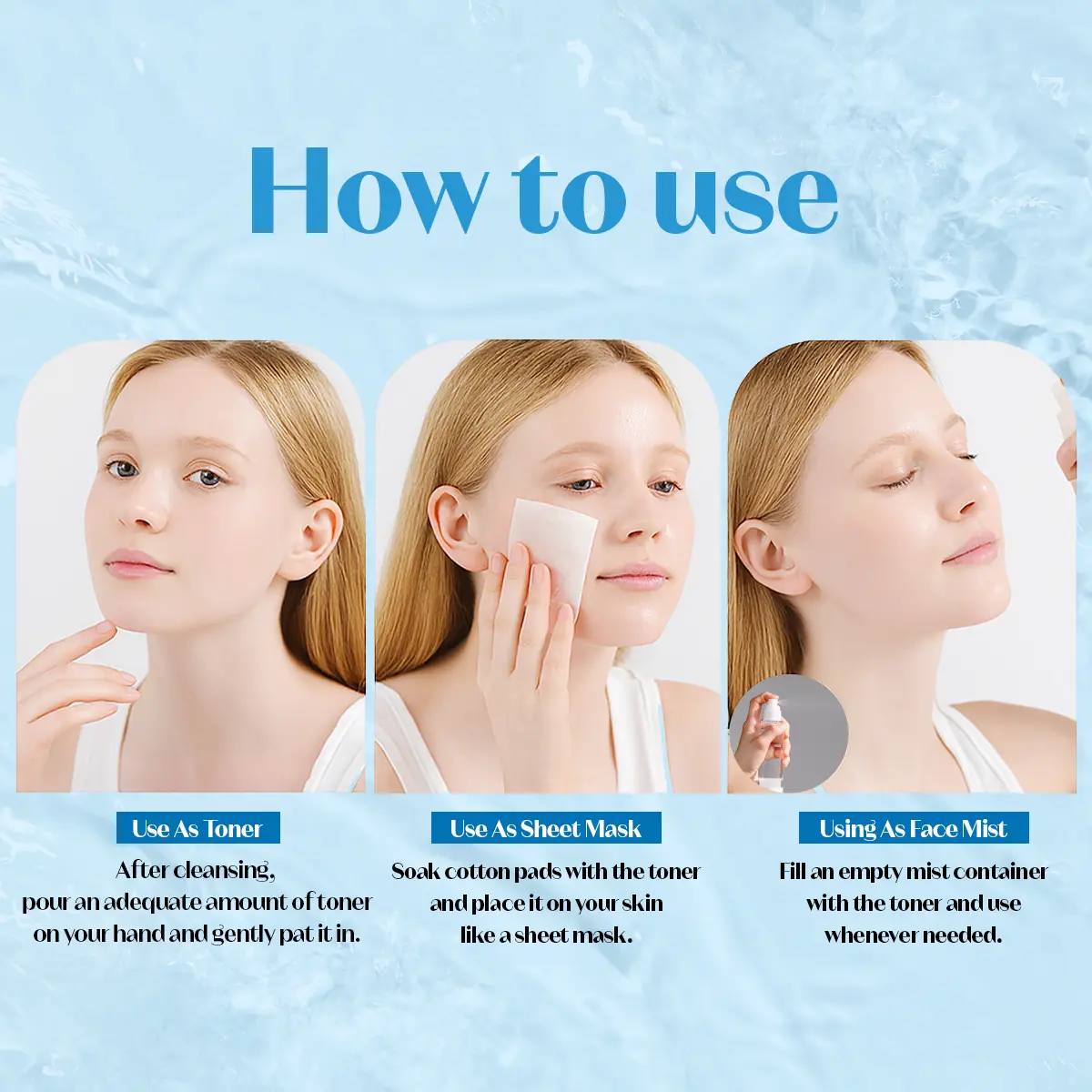 ·Follow up with your favorite serum and moisturizer. Using this toner first helps set the stage for optimal absorption of subsequent products, maximizing their benefits.