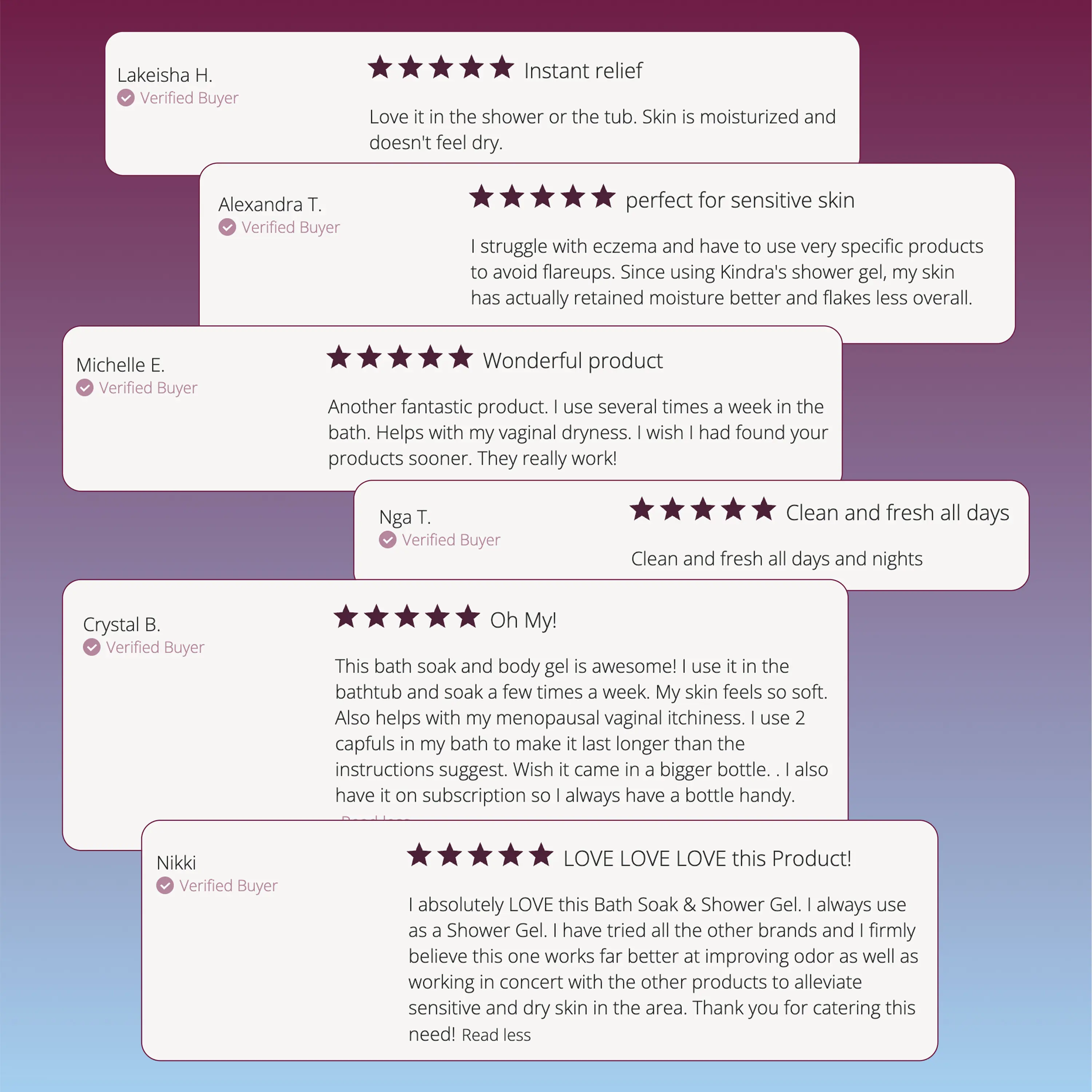 This Kindra Soothe Bath Soak & Shower Gel is fabulous. This is my third bottle and it is so great for sensitive skin. This soothe bath soak & shower gel really does work. I just love it. Thank You, Kindra for such amazing product.