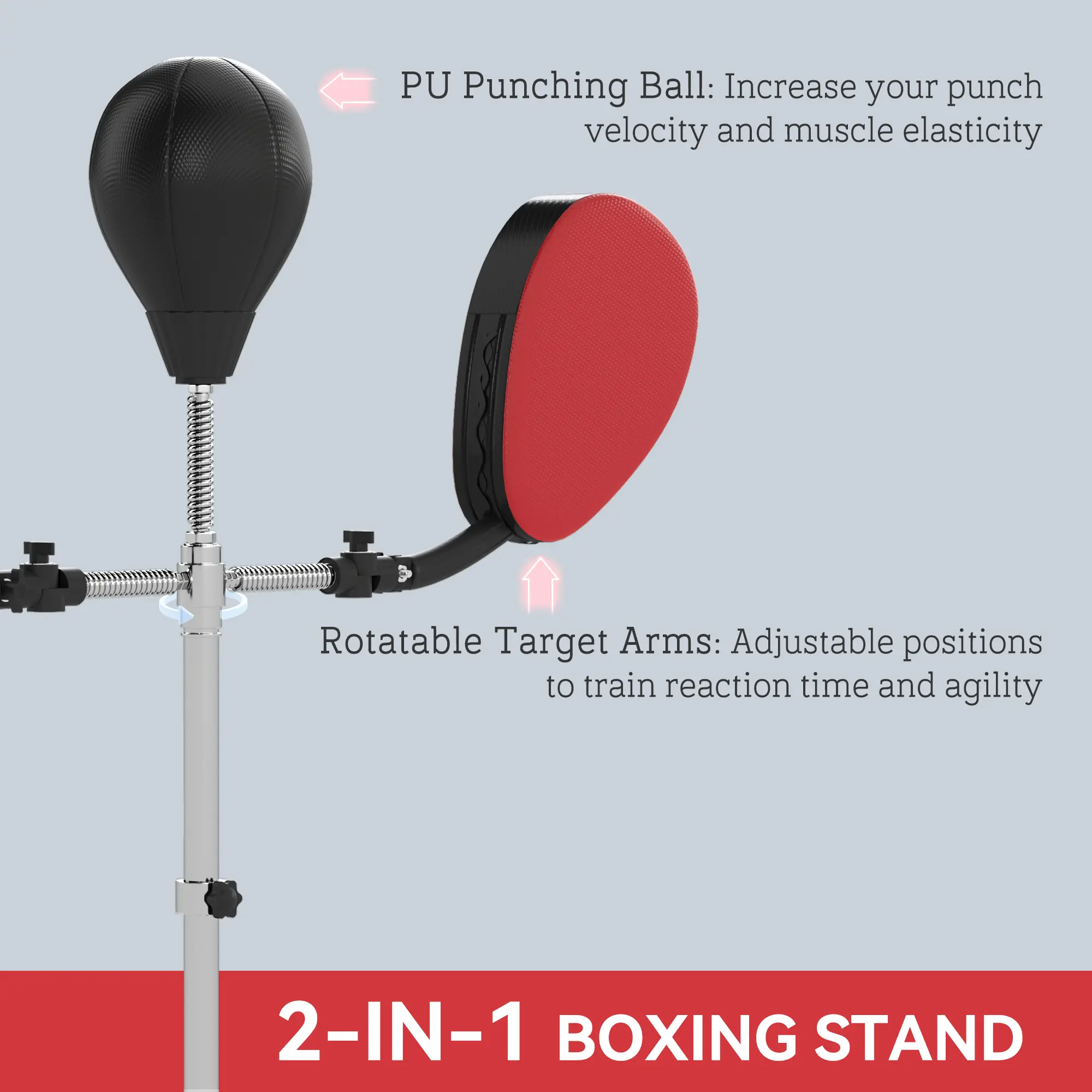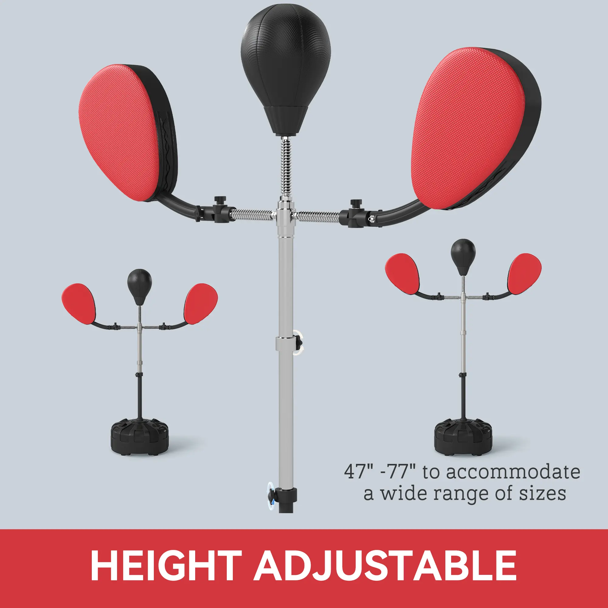 All-in-1 Training Set: This speed bag platform includes a PU punching ball and two adjustable target arms, helping you boost boxing skills, agility, and balance for a full-body workoutHeight for Every Athlete: The speed bag platform adjusts easily from 47" to 77", making it great for youth, adults, and super heavyweight boxers alikeSmooth Rebound Action: Strong steel springs on this boxing reflex bag absorb shocks, delivering consistent, responsive rebounds for effective trainingStable Base for Intense Workouts: The heavy-duty base of this punching bag with stand holds up to 44 lbs of sand or 33 lbs of water, with 12 suction cups for extra grip during tough sessionsSize & Capacity Details: Speed bag platform measures 35.4" L x 18.9" W x 47-77" H