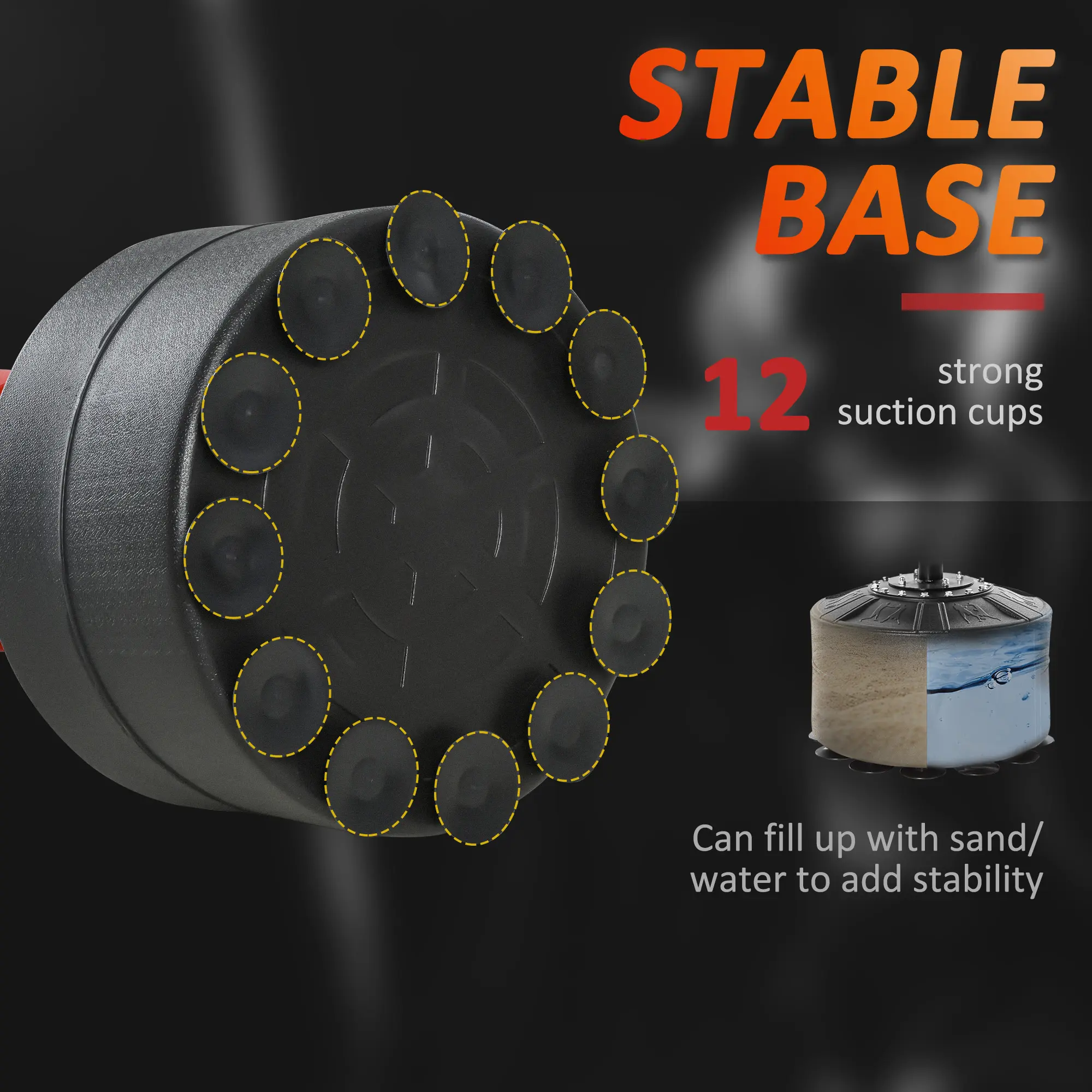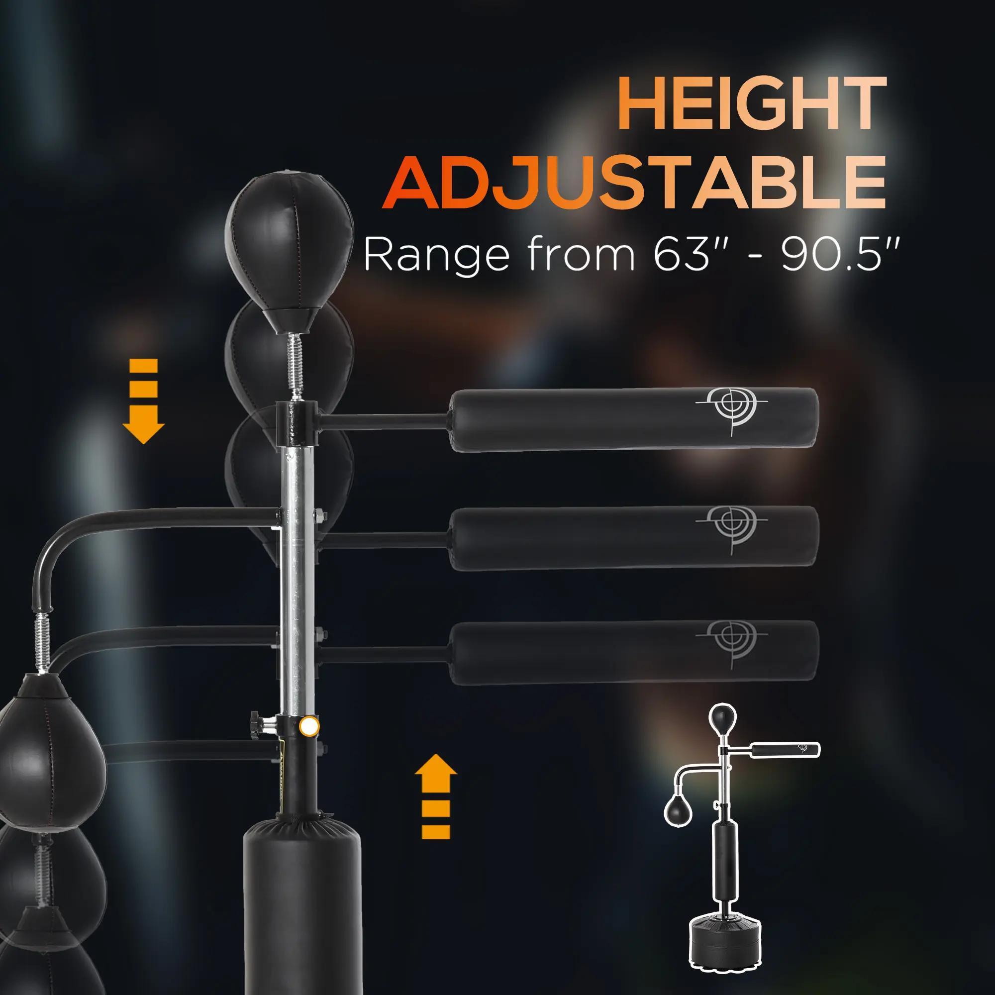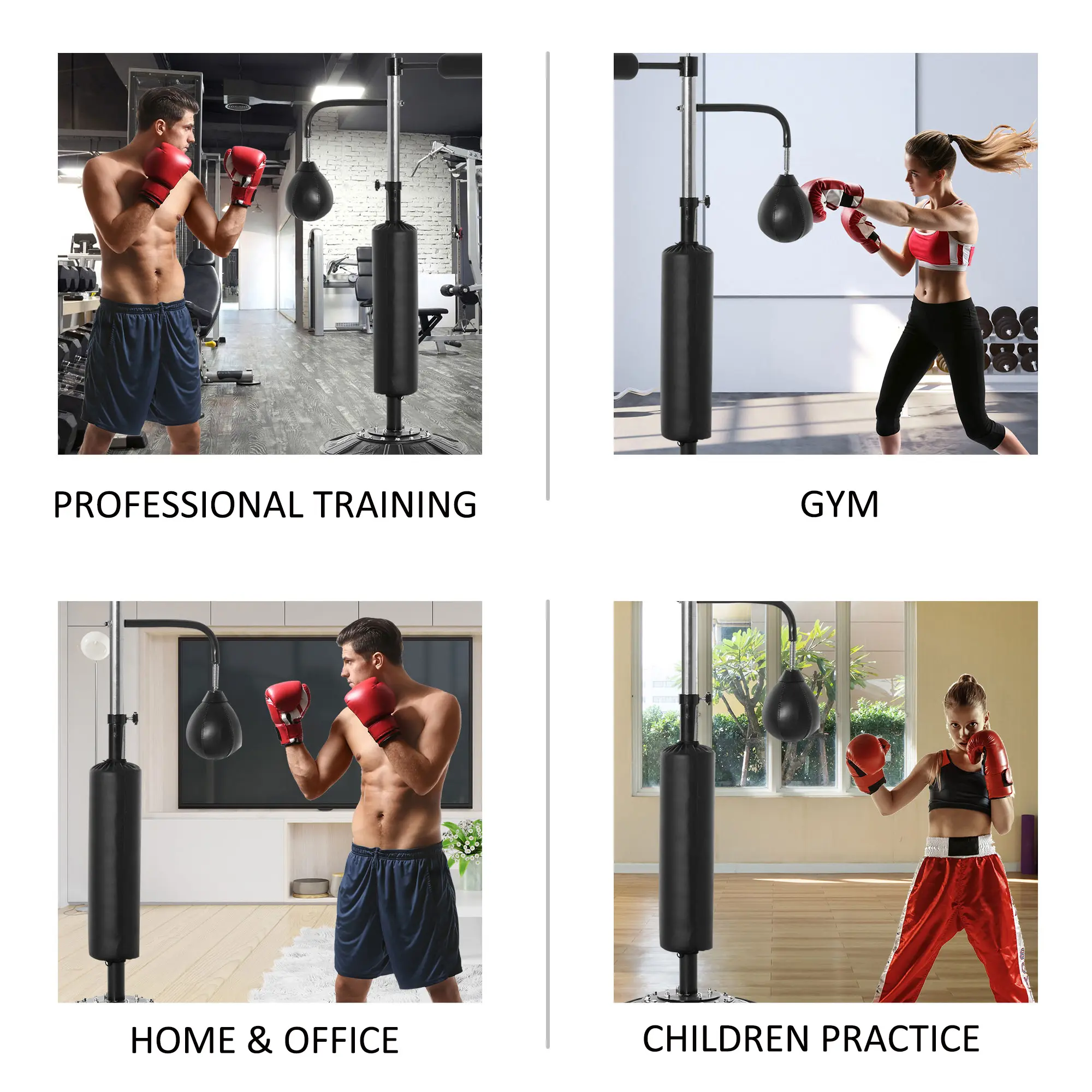 Boxing Training Center: Our free standing speed punching bag has a 4 in 1 function, coming with two speedballs, a 360° reflex bar, and a PU-wrapped boxing bag. This makes our punching bag with stand a great workout right at home, or at the gym or office.Adjustable Height: The height of this boxing equipment ranges from 63" - 90.6", great for any height of use. This punching stand is suitable for most people, such as teenagers and adults, professional athletes, or boxing lovers.Fillable Freestanding Base: The base holds water, sand, or both to keep the bag steady. In addition, the boxing bag is equipped with 12 suction cups that allow for better stability. When empty, the kickboxing bag is easy to move and store.Physical Fitness: Boxing is a good stress-relief exercise! This reflex bag boxing can help raise your heart rate for a great workout while helping you develop timing, speed, and accuracy of hand and eye coordination.Punching Bag for Adults Dimensions: Overall Dimensions: 34.6" L x 19.7" W x 63" - 90.6" H. Base Size: 19.7" Dia. x 10.6" H. The base can hold 99 lbs of sand, 66 lbs of water, or 88 lbs of a sand/water mix.