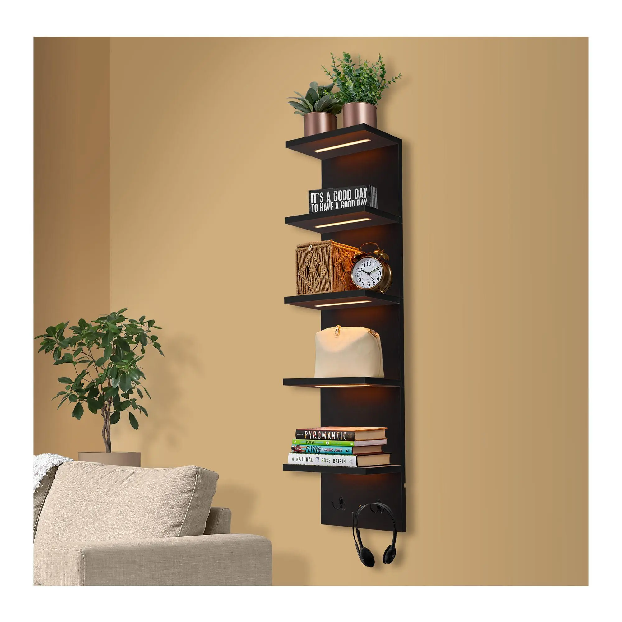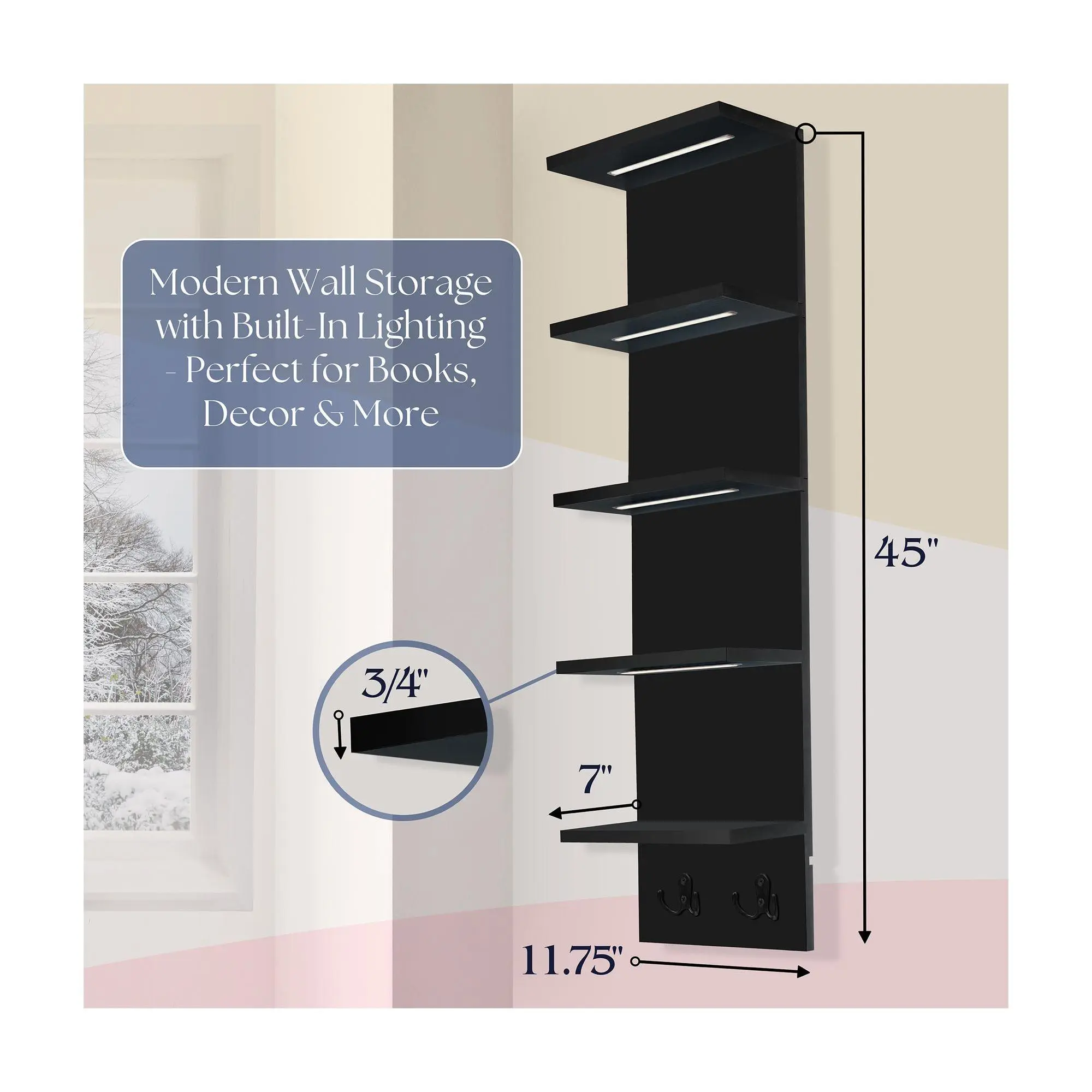 Embrace modern elegance while organizing your space with this illuminated corner wall unit. Effortlessly display beloved books, cherished keepsakes, or prized trophies on its five sturdy tiers. The built-in LED lighting, controllable via remote, adds a magical touch, creating the perfect mood with adjustable brightness and multiple tone options. Ideal for any room, its sleek design and versatile storage hooks elevate functionality while blending seamlessly with your decor. From Sorbus.