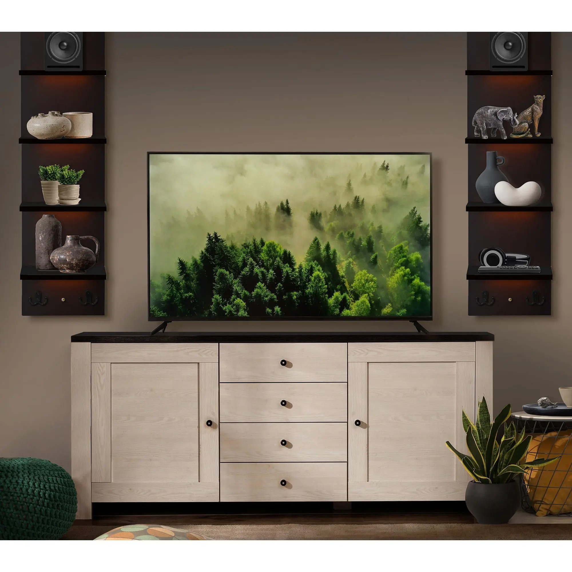 ·Includes shelf unit, four hooks, hardware, and remote
