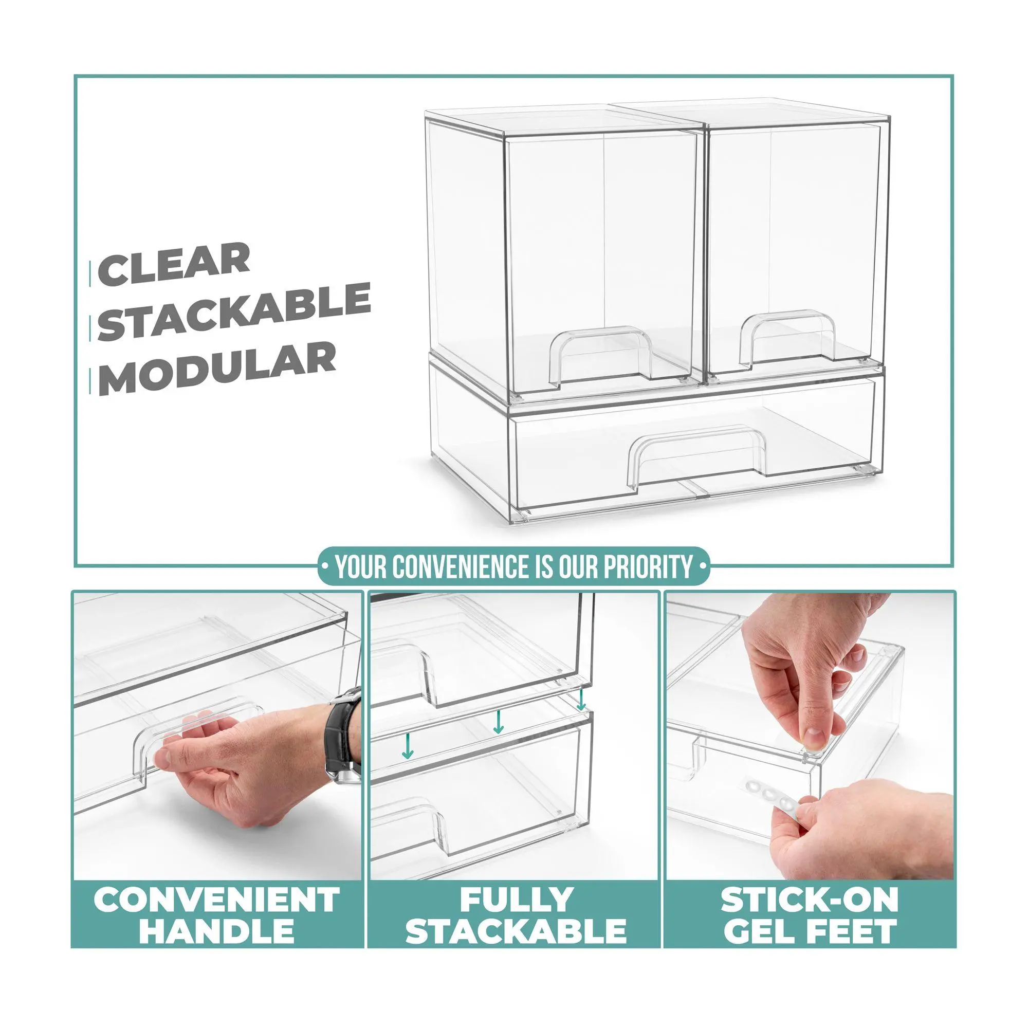 The Sorbus Clear Organizer Drawers offer a versatile, stackable design to maximize storage and customize your space. Perfect for organizing countertops, cabinets, or under-sink areas, this acrylic system is ideal for makeup, pantry items, office supplies, and more. With smooth-gliding pull-out drawers and built-in handles, accessing essentials is effortless. These durable and stylish organizers blend seamlessly with any decor and are easy to clean with soap and warm water. From Sorbus.
