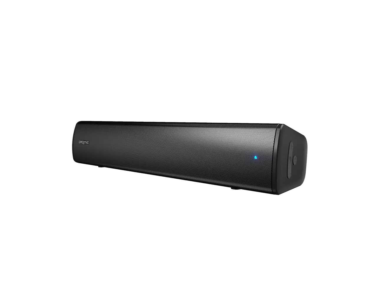 The playback and volume control buttons are conveniently located on the side of the soundbar with LEDs that indicate device status on its front panel.
