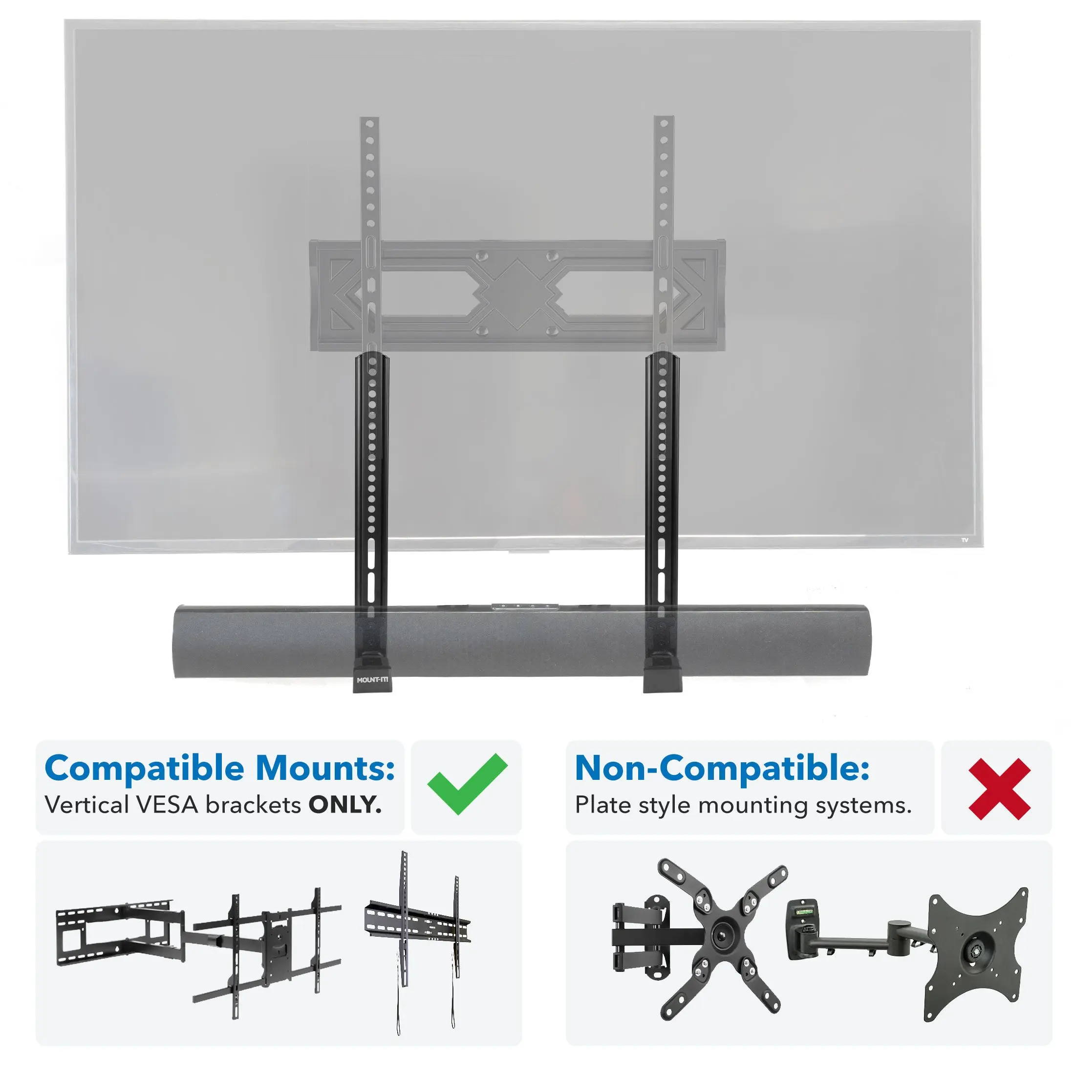 The MI-SB50 is compatible with most TVs using standard VESA patterns. It is VESA compatible and supports soundbars between 3.5 and 6.1 inches.