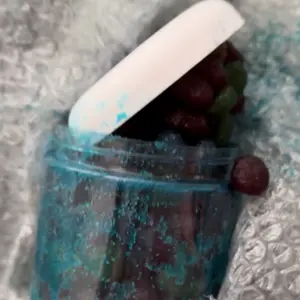 The product is very good, however mine looks like it melted or something on the way here. When I see videos of this everyone else's is more bright blue and you can see the powder on it. This is how mine came. Taste is still good though.