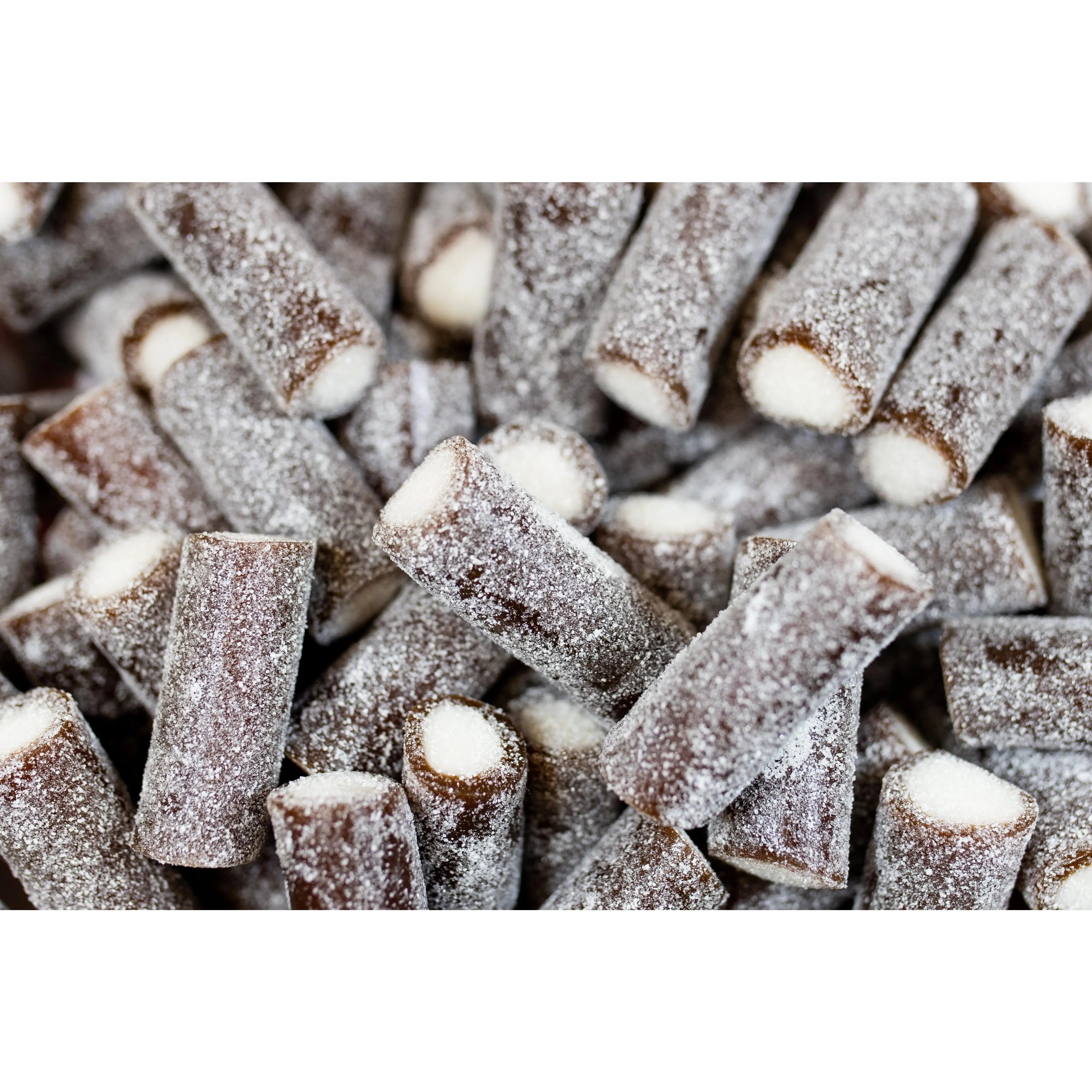 Ingredients: Sugar, glucose-fructose syrup, wheat flour(gluten), acid (malic acid, citric acid), fully hydrogenated vegetable fat (palm kernel, coconut), humectant (glycerol), emulsifier (mono- and diglycerides of fatty acids), thickener (gum Arabic), modified maize/corn starch, malt extract from barley(gluten), flavoring, cocoa powder, syrup, salt, glazing agent (carnauba wax).