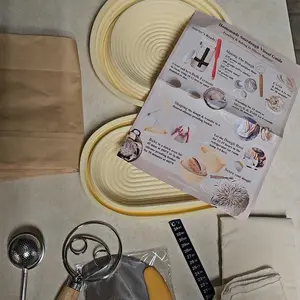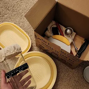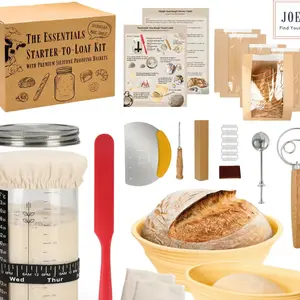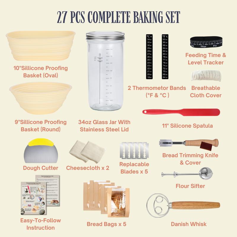 This complete sourdough bread starter kit is specially designed to make the starter process and baking easier. It includes 34oz Glass Jar, 11" Silicone Spatula, 9" Silicone Proofing Basket (Rond), 10" Silicone Proofing Basket (Oval), Danish Whisk, Feeding Time & Level Tracker, Thermometer Band, Breathable Cloth Cover, Bread Trimming Knife with 5 Replaceable Blades, Metal Scraper, Flour Sifter, 2 Proofing Cheesecloth, and 5 Paper Bread Bags (with windows and tin ties). It is a perfect gift set for sourdough baker & baking beginner.