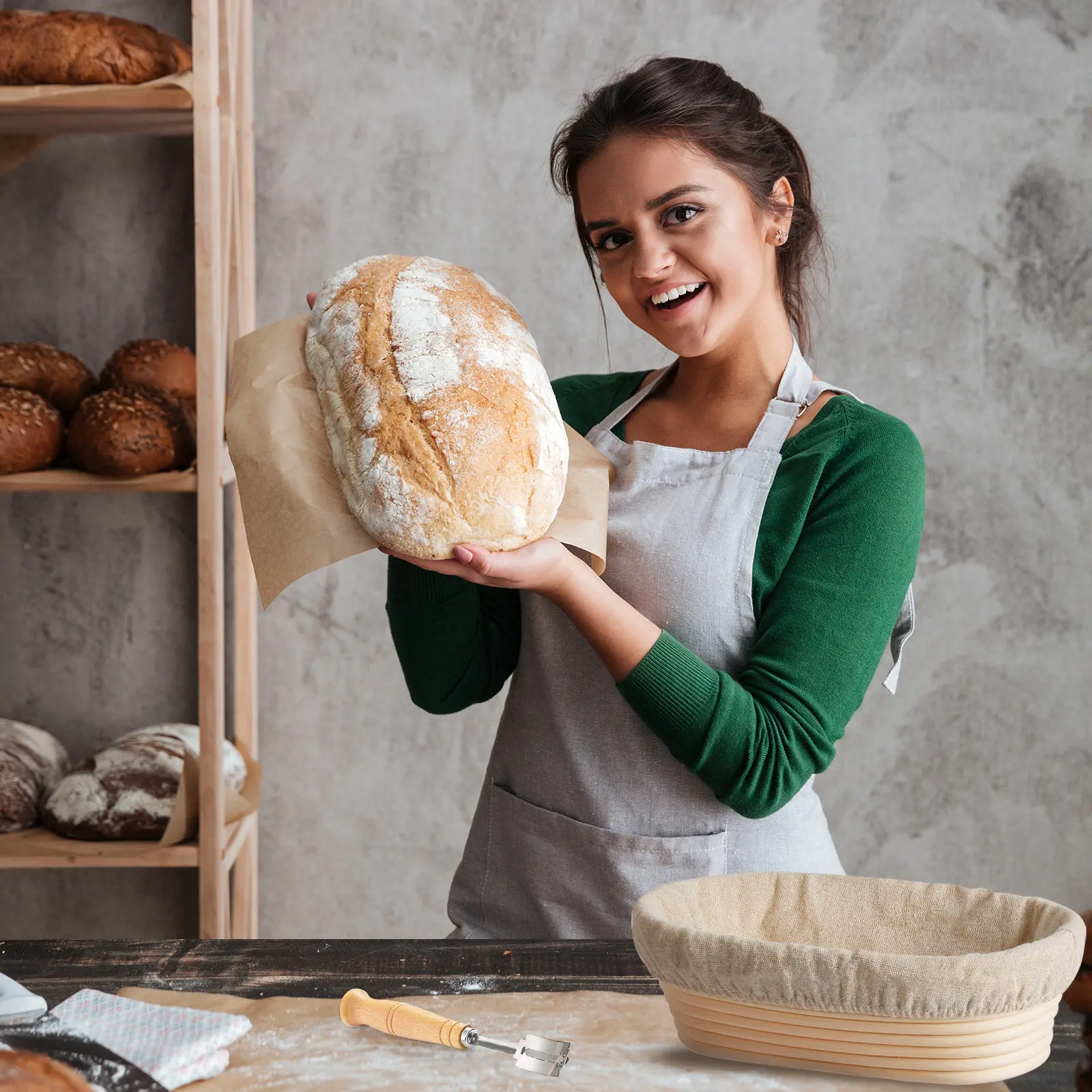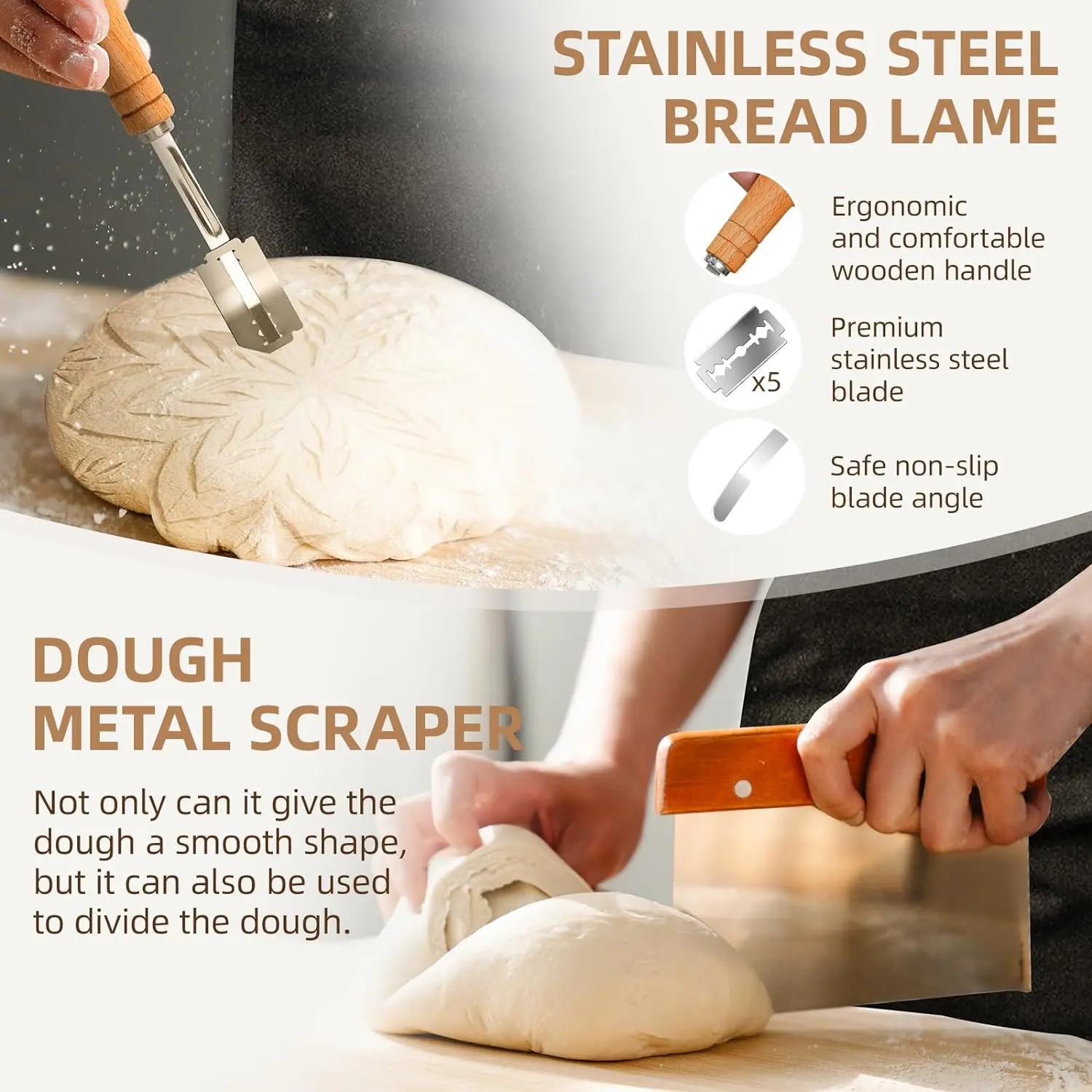 【ESSENTIAL BAKING KIT】This kit contains:3 round bread baskets (10 inch,9 inch,8 inch), bread lame *1, blade *5, stainless steel scraper *1, dough whisk *1, parchment paper sheet *30. These bread making tools are enough to get you through the whole bread-making process, and anyone can be a baker.